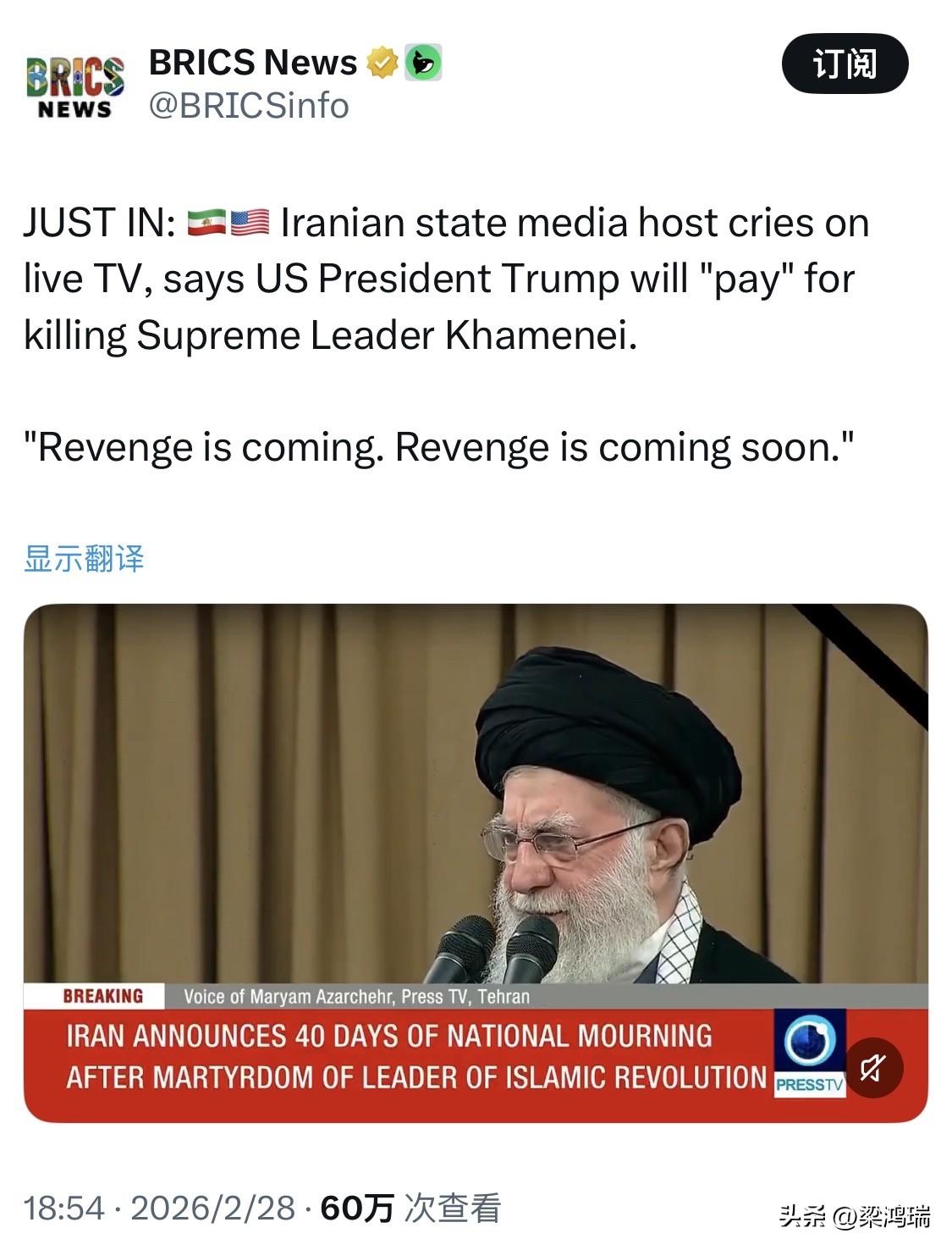 最新消息: 伊朗国家媒体主持人直播中痛哭流涕,称美国总统特朗普将为杀害最高领袖哈梅内伊“付出代价”。 “复仇即将到来。复仇很快就会到来。”