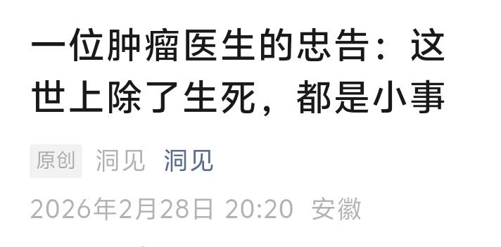 四川肿瘤医院医生含泪讲述:那个肝癌晚期的年轻妈妈,在出院前回头看了一眼白发父亲,瞬间崩溃…原来除了生死,人生真的没有大事 (来源: 洞见) 四川省肿瘤医院的医学博士杨钦焱,在一次分享中哽咽着提起一个年轻肝癌女孩的故事。女孩病情已到晚期,肺部布满转移的癌细胞,治疗无望后,她决定出院用最后时间陪伴孩子。可当看到七十岁父亲佝偻的背影时,她突然放声大哭——原来最撕心裂肺的,不是面对死亡,而是无法陪父母走到岁月尽头。 医生红着眼眶说,在肿瘤医院待久了,你会彻底明白:你所厌倦的今天,是无数患者渴望却再也触不到的明天。能大口呼吸、自由行走、拥抱所爱之人,已经是生命最慷慨的馈赠。那些躺在病床上挣扎的身影,用尽全力只为多看一眼窗外的光。 一位三甲医院的朋友曾聊起两个病人。一个是电视台制片人,拼酒熬夜换来了事业巅峰,却突然确诊慢性肾炎。他苦笑着说:“以前以为工作是皮球,掉下去还能弹起来。现在才懂,健康是玻璃球,一碎就什么都没了。”存款填进医院,曾经争破头的项目,在病床上回想竟轻如尘埃。 另一个是八岁孩子的妈妈。儿子确诊高钾血症那天,她蹲在医院走廊哭了两个小时。从前她疯狂“鸡娃”,报班竞赛一样不落,生怕孩子输在起跑线。如今她只说:“我只要他活着。”当健康崩塌,所有攀比与焦虑都成了虚无的泡沫。 国外有位妈妈参加学校殡仪馆体验课,躺进棺材的瞬间,黑暗吞噬了她。在死寂中,她想起孩子哭泣的脸、丈夫孤单的背影,眼泪汹涌而出。棺盖打开时,她仿佛重生——原来活着本身,就是奇迹。冯仑也曾因误诊以为命不久矣,坐在出租车里看北京街景,突然发现最普通的梧桐与阳光,竟美得让人心颤。 东京有家叫“DAWN”的咖啡馆,店员全是卧床患者远程操控的机器人。一位肌营养不良症患者通过机器人与顾客交谈,声音却充满元气。他们连呼吸都需借助仪器,却仍在黑暗中努力发光。走进那里的人,都会被一种炽热的生命力击中:我们抱怨的日常,正是别人奢求的远方。 网友“晚秋依旧”留言说:“我癌了,治疗路很长,但能多陪家人一天就是幸运。”这条留言让无数人泪目。健康时总觉得疾病遥远,直到身体叛变才懂,每一刻平安都是侥幸。另一条高赞评论写道:“曾经被误诊癌症,复查正常后,每一天都像中了彩票。” 若你此刻正为工作焦虑、为感情纠结、为未来迷茫,不妨去医院肿瘤科走廊或ICU门口静静站一会儿。看看那些插着管子仍努力呼吸的人,看看那些紧握病床栏杆的颤抖的手。那时你会明白:人生没有过不去的坎,只有不够珍惜的当下。 活着不是彩排,每一天都是正式演出。别再为琐事耗尽心力,别再等失去才懂珍惜。能好好吃饭、安心入睡、拥抱身边人,已是命运最大的偏爱。 生死感悟 珍惜当下