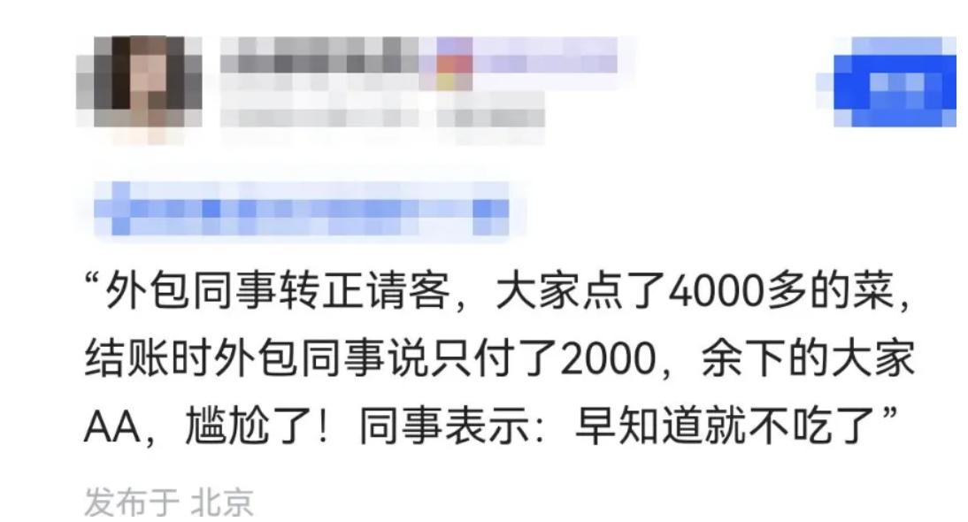真是越想越气!! 外包同事好不容易熬到转正,第一时间在群里说要请客吃饭,庆祝自己顺利上岸,大家也都真心为他高兴,十几个人热热闹闹一起去了饭店。 本来大家都以为就是一顿普通的庆祝饭,结果席间不断加菜,饮料酒水一瓶接一瓶,账单拿过来时,总价竟然高达 4000 多块。 大家当时都没多想,毕竟是同事主动说请客,谁也没准备自己掏钱,可结账时,最尴尬的一幕还是发生了。 同事只扫了 2000 块,然后很自然地对我们说,剩下的钱大家一起 AA 吧。现场瞬间安静,所有人都愣住了。 明明是你说要请客,我们才放下顾虑过来,你转正我们真心祝福,可你不能这么办事啊。有网友直接说:这哪是请客,这是组团坑同事。 你要是预算不够,完全可以提前说清,我们可以吃平价餐厅,或者直接 AA,没人会笑话你。可你心里只准备 2000,却从头到尾不说,等吃完才提 AA,这不是把所有人架在火上烤吗? 最无奈的是,一桌人吃也吃了,走也走不掉,只能默默分摊,那顿饭吃完,所有人心里都堵得慌。 这件事真给所有职场人上了一课:聚餐要么说清 AA,要么量力而行请客,千万别打肿脸充胖子,让所有人跟着尴尬。 大家说,遇到这种事谁能舒服?换作是你,会愿意 AA 吗?