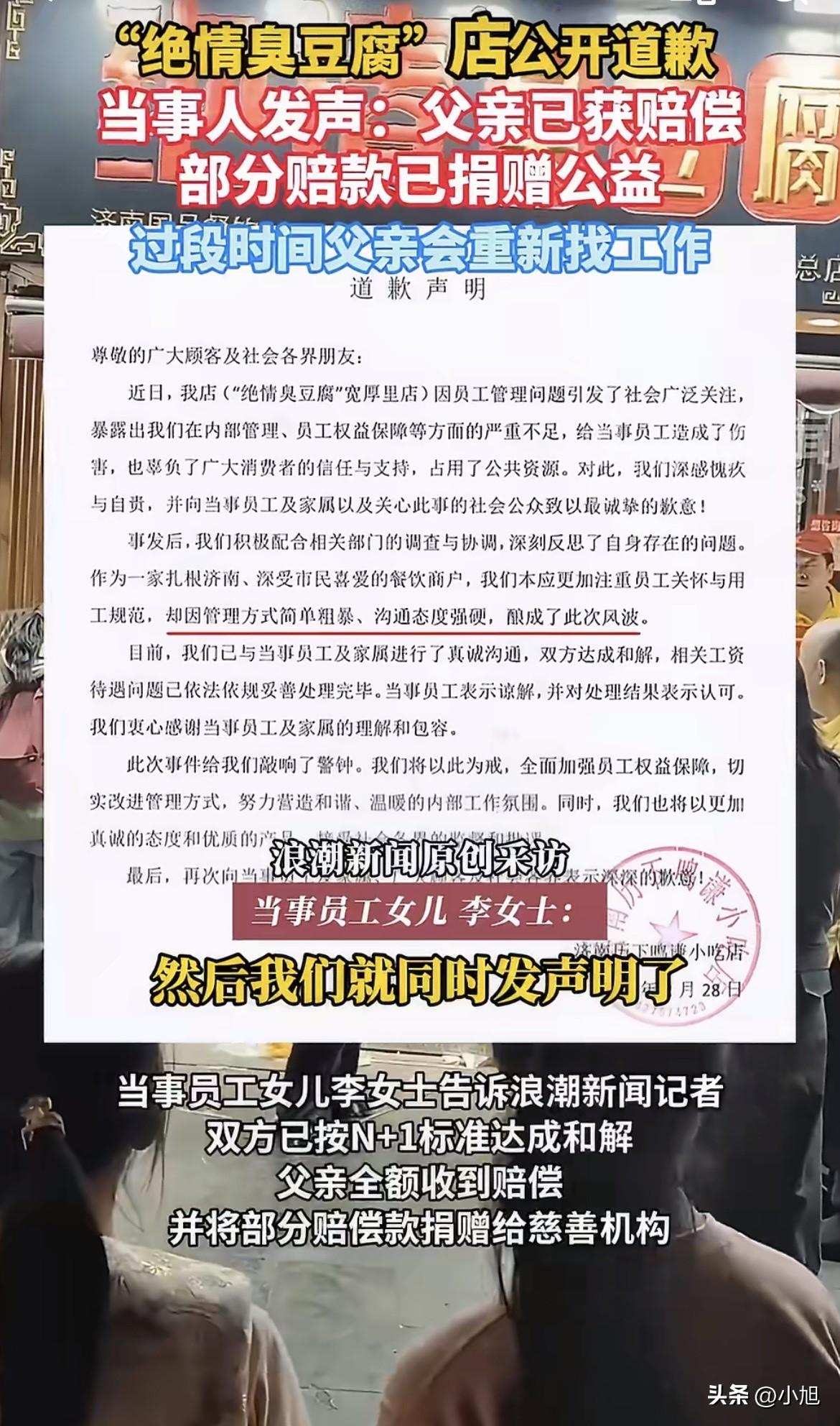 女儿想请父亲吃顿离别饭,打个电话请假,但亲爹饭碗却丢了,爸爸拿到八万多月薪的赔偿,还把钱捐了。 正月初五晚上九点多,李女士第二天就要回杭州上班,她爸在济南宽厚里这家“绝情臭豆腐”店当炸锅师傅,春节只歇了一天。她就想临走前跟爸吃顿团圆饭,打电话给老板,态度特别好,说晚上十一点后人少了,给爸请两小时假,该扣多少钱工资她出。 电话那头老板硬邦邦回了一句:一分钟也不行。挂了这个电话,老板直接打给她爸,说敢请假就把他辞退。 李女士气不过,连夜赶到店里理论。她在店门口哭着喊老板太绝情,视频被人拍下来发到网上。记者打电话去店里核实情况,接电话的工作人员来了一句“关你什么事”,然后直接挂了。 事情闹大后,济南历下区人社局和大明湖街道都介入了。 2月28号,这事有了结果。店家发了道歉声明,说内部管理和员工权益保障存在严重不足。李女士说,她爸在店里干了七年三个月,最后按N+1的标准拿到赔偿,总共8.5个月工资。 让人没想到的是,李女士一家商量后,把赔偿款拿出一部分,捐给了韩红爱心慈善基金会,整整29061.5元。 李女士专门发了个声明,说特别感谢网友和媒体帮助,不想消费大家的善良,不会借这件事开店,让大家以后看到相关店铺谨防上当。她爸今年53岁,会先休息一阵子再找工作。 老板为了两小时不给请假,最后赔了人家八个半月的工资。干了七年多的老员工,换来一份和解协议。最讽刺的是店名叫“绝情”,这回是真做到了。 女儿请爸爸吃顿饭,就这么难吗。大家怎么看这事。