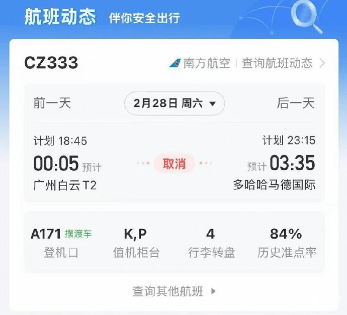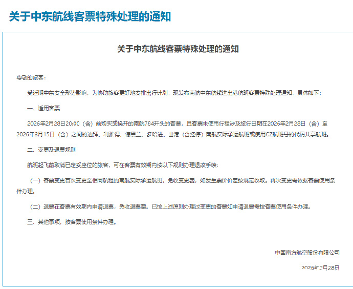南航发布关于中东航线客票特殊处理的通知称,2月28日20时(含)前购买或换开的南航784开头的客票,且客票未使用行程涉及旅行日期在2月28日(含)至3月15日(含)之间的迪拜、利雅得、德黑兰、多哈进、出港(含经停)南航实际承运航班或使用CZ航班号的代码共享航班,航班起飞前取消已定妥座位的旅客,可在客票有效期内按规则办理退改手续。在客票有效期内申请退票,免收退票费。