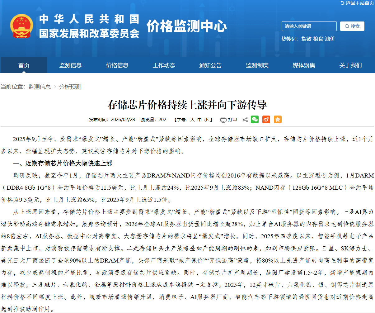 2月28日,国家发改委价格监测中心发文称,2025年9月至今,受需求“爆发式”增长、产能“断崖式”紧缺等因素影响,全球存储器市场缺口扩大,存储芯片价格持续上涨,近1个月多以来,涨幅呈现扩大态势,建议关注存储芯片对下游价格的影响。