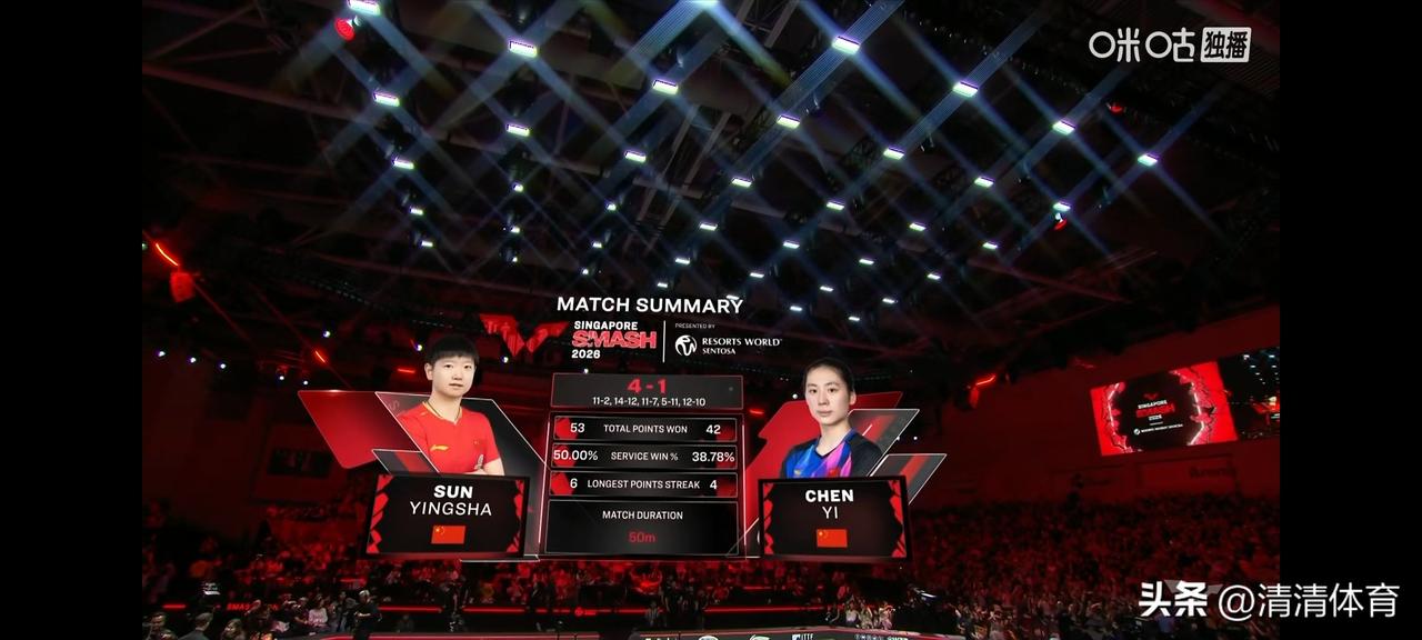 2026WTT新加坡大满贯 孙颖莎4-1陈熠(11-2、14-12、11-7、5-11、12-10),强势晋级女单决赛! 开局火力全开,关键分稳准狠,第五局顶住压力12-10锁定胜局,状态拉满。另一边王曼昱连斩多国一姐、力克特殊打法强势突围,决赛迎来巅峰对决:孙颖莎 VS 王曼昱。 国乒提前包揽冠亚军,巅峰之战一触即发,谁能捧起大满贯奖杯,我们期待!