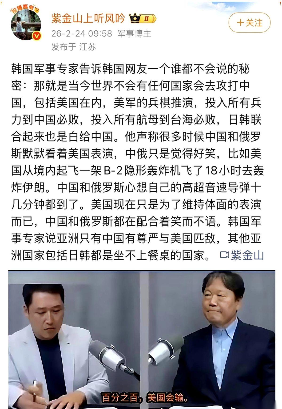 韩国一档节目,一个军事专家,当着镜头的面,直接把话挑明了。 他说,现在这个世界上,没有任何一个国家敢动中国,一个都没有,美国也算在内。 这话一出,估计演播室的导播都得掐一下自己大腿。 要知道,韩国长期以来都是美国在东亚的紧密盟友,军事上深度绑定,外交上也多有依附,这样一句打破常规、甚至看似“背离”盟友立场的话,从韩国军事专家口中说出,绝非一时冲动,更不是刻意博眼球,背后是对中美军事博弈格局的理性判断,也是对当前全球地缘形势的客观认知。 很多人疑惑,这位韩国专家的底气到底来自哪里?其实答案很简单,不是吹捧,不是偏见,而是实实在在的实力对比,是中美两国综合战力的差距,早已注定了这样的结论。 如今的大国博弈,早已不是几十年前靠飞机大炮数量取胜的时代,更不是某一个国家可以凭借霸权肆意妄为的时代。 美国虽然依旧顶着全球军事第一的头衔,却早已露出了诸多短板。 它需要万里跨洋向亚太地区投送兵力,而中国只需在家门口以逸待劳,美军苦心经营的第一、第二岛链,所有关键节点都在中国的区域拒止能力覆盖范围内,那些看似威风的航母和前沿基地,其实毫无安全保障可言。 更关键的是,美国的工业根基早已不如从前,失去了大规模战争所需的完整制造业体系,精确制导弹药、舰船零部件等关键装备,常常面临产能不足、交付迟缓的问题,真要爆发长期对抗,根本撑不起持续消耗。 再看内部,美国的政治分裂、社会对立越来越严重,两党为了选举互相掣肘,民众对海外军事干预早已厌倦,巨额的战争开支只会进一步加剧国内矛盾,这样的状态,根本没有底气发动一场针对中国的大规模战争。 反观中国,几十年埋头苦干,早已建成了完整的陆海空天火箭军体系,装备先进、体量巨大。 东风系列、长剑系列导弹,射程远、精度高,还能实现机动变轨,美国现有的反导系统,拦截成功率低得可怜;空警-500、空警-3000预警机,能同时跟踪数百甚至上千个目标,比美国的E-3预警机领先至少一代。 更重要的是,中国拥有全球最完整的工业体系和强大的动员能力,补给链短、生产效率高,哪怕是持续作战,也能快速完成补给,这是美国远远比不了的战争潜力。 除此之外,韩国专家的判断,也藏着对本国利益的清醒认知。 韩国进出口银行海外经济研究所的报告显示,韩国在芯片核心原材料上对华依赖度不断上升,仅多晶硅的依赖度就从2022年的68.8%升至2023年的75.4%,锗、镓等下一代半导体所需原材料的依赖度更是大幅提升。 三星电子闪存产品的中国西安工厂,生产比重逐年上升,预计今年年底将达到40%。 对韩国来说,深度嵌入中国产业链的经济结构,让它根本承受不起对华脱钩的代价,更不敢轻易追随美国对抗中国。 更何况,美国长期对韩国进行军事控制和经济压榨,高额的驻军分摊费、不平等的贸易协定,早已让韩国民众对美国的信任度跌至谷底,韩国精英阶层也逐渐看清,美式同盟的本质,不过是把韩国推上前线充当炮灰。 其实,美军在亚太地区频繁搞演习、秀肌肉,看似声势浩大,本质上不过是给自己和盟友壮胆。 一旦在台海地区发生冲突,美军将遭受惨重损失,十几个基地被摧毁、两艘航母沉没,九成远程导弹被耗尽,亚太地区九成的战机在开战初期就会被摧毁。 这样的结果,美国政客心里比谁都清楚,所以他们嘴上喊得强硬,实际行动却异常谨慎,顶多搞搞极限施压、打打代理人牌,根本不敢亲自下场与中国开战。 毕竟,中美作为全球前两大经济体、核大国,一旦爆发直接军事冲突,后果是毁灭性的,没有赢家,全球供应链会崩溃,金融市场会动荡,能源粮食危机也会随之爆发,数十亿人都会被卷入灾难。 韩国专家的这番话,看似惊人,实则是时代发展的必然,是实力对比的客观结果。 中国如今的威慑力,从来都不是凭空而来的,是无数人几十年埋头苦干、奋力拼搏挣来的,是抗美援朝战争中,中国军队以弱胜强、打出国威军威换来的底气,更是中国始终坚持和平发展、捍卫国家利益的坚定决心铸就的。 冷战思维早已过时,集团对抗没有未来,相互尊重、和平共处、合作共赢才是时代正道。 美国与其沉迷于霸权幻想,不如正视自身的困境与时代大势,放弃零和博弈,停止挑衅施压,回归理性对话的轨道。