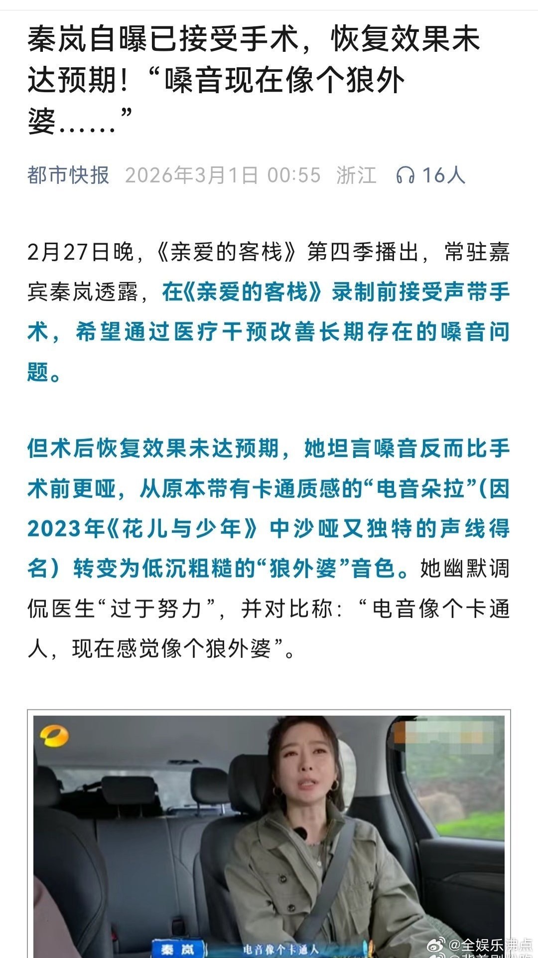 健康第一,希望秦岚多休息,身体最重要。秦岚嗓子动手术但未达预期亲爱的客栈
