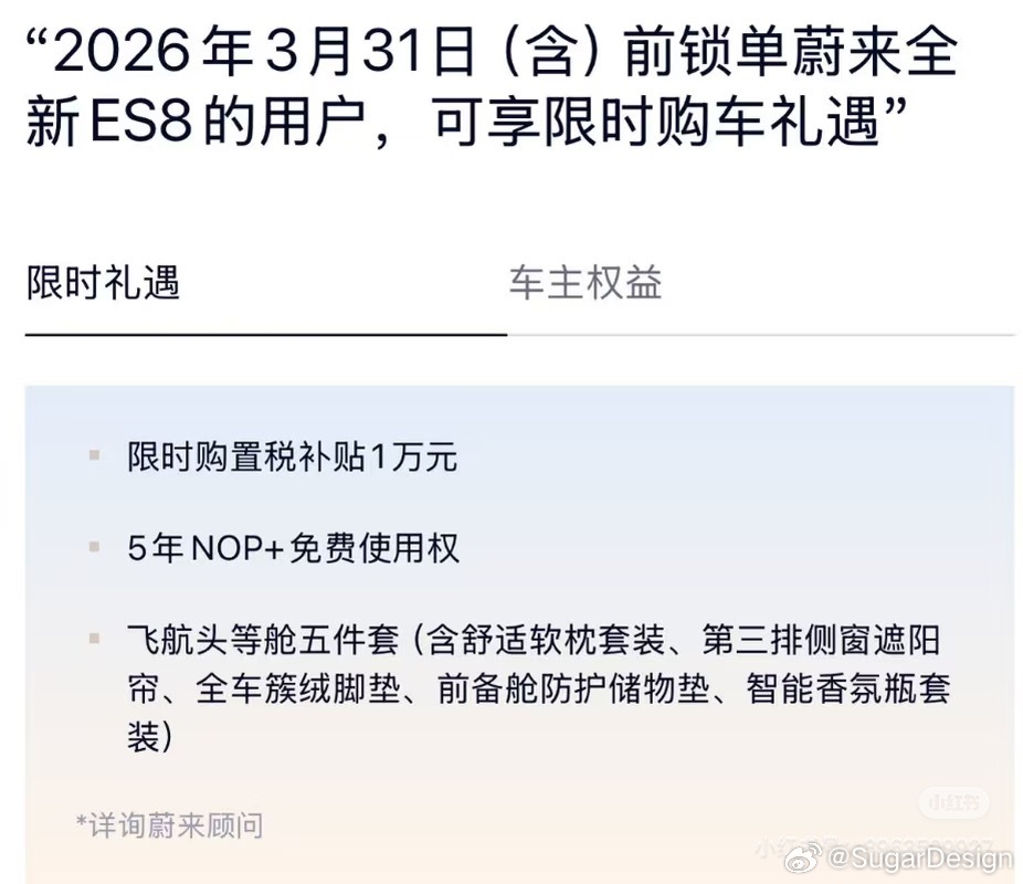 在3月31日前,ES8未开票和新订单用户可以享受10000元的购置税补贴(直接减车价)。