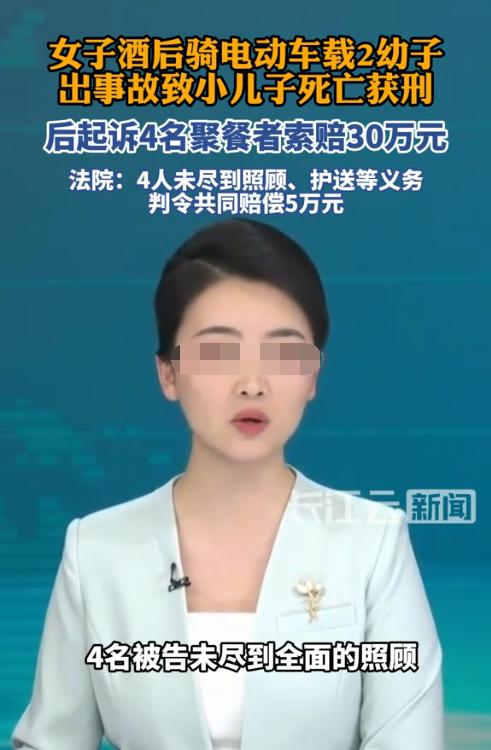 云南昆明,一女子带着两个幼童与4位朋友聚餐结束,醉酒驾驶电动车载着2个孩子回家,途中不慎撞上绿化带,导致其中一个孩子死亡,自己也受了轻伤。女子因交通肇事罪获刑1年,缓刑1年后,觉得气不过,于是将4位朋友告上法院,认为是朋友劝酒才导致其出了交通事故,故向他们索赔30万余元,没想到法院竟支持了部分。 据悉,女子骆某已经结婚多年,有两个年幼的儿子。可即便如此,骆某还是少年心性,总想着玩耍。 2024年12月15日的下午,骆某骑电动车带着两个儿子前往陈某家,两个儿子一前一后乖乖坐着,但都没有佩戴头盔。 不久后,三人来到了陈某家中,陈某正在做饭,也不用骆某帮忙,骆某只能陪着两个儿子在客厅玩耍。 期间,陈某叫来了男子宋某,并让他带点菜,而宋某则带着男子武某一起去买了点菜,然后赶往陈某家中。骆某见状,把男子沈某也叫了过来,让他带点好酒。 这本来4人的聚餐,瞬间变成了7个人,一下子就热闹了起来。当晚,骆某和陈某等人就喝上了,大家推杯换盏,喝得十分开心。 吃完饭后,大家都没有要走的意思,于是骆某提议去唱KTV,这个提议得到了大家的一致赞成。 之后,骆某又骑电动车带着两个儿子去了KTV,和大家边喝啤酒边唱歌,一直玩到了次日凌晨2点多。 陈某和宋某因为实在熬不住了,所以提前离开。骆某带着两个儿子与武某、沈某玩到了凌晨3点才离开。 由于骆某和武某都是骑电动车的,所以沈某先打车离开,骆某则载着两个儿子往家里赶去。 一路上骆某几次差点醉倒,但都强撑着,直到3点23分左右,骆某骑车行驶到某网吧门口时,车辆突然失控,冲上了旁边的绿化带,然后车辆继续前行,撞上绿化带内的凉亭水泥柱。 骆某的大儿子在坐在后座,当场就被甩了出去,小儿子因坐在电动车踏板上,在车辆摔倒后就被车辆压着,骆某也倒在一旁。 事故发生后,有路人见状报了警并叫了救护车,很快小儿子和骆某被送到医院救治,但小儿子最终因抢救无效死亡,而骆某的伤情达到了轻伤二级,所幸大儿子没事。 对于此次事故,交警队的认定是单方交通事故,骆某承担全部责任。 根据《关于审理交通肇事刑事案件具体应用法律若干问题的解释》第2条第1项规定,交通肇事致死亡1人或者重伤3人以上的,负事故全部或主要责任的,构成交通肇事罪,处3年以下有期徒刑或者拘役。 因此,骆某被法院判处了1年有期徒刑,缓刑1年。 事故发生后,父母和丈夫都指责骆某的不负责,这让骆某的家庭差点完全破裂。 在骆某自闭的那段时间,丈夫认为小儿子不能白死,他决定要为小儿子讨个公道,于是要求骆某配合将事发当晚一起喝酒的陈某、宋某、武某、沈某一并告上了法院。 在法庭上,骆某的丈夫表示,如果陈某等4人能够在事发当晚不劝酒,在聚餐结束后能提个醒或者劝阻醉驾的行为,那事故就不会发生,小儿子也不会死。因此,陈某等4人应当赔偿30万元,作为未尽到照顾义务的责任。 面对骆某夫妇的起诉,沈某首先提出了异议,他认为是骆某邀请自己去喝酒唱歌的,骆某才是组织者。 陈某和宋某则认为自己二人已经提前离开,并不知道骆某是怎么回家的,所以与自己二人无关。 武某则感到十分委屈,称自己看着骆某喝多了,还带着两个孩子,所以就劝骆某打车回家,但骆某不听。为了以防万一,自己还跟着开了一段路,发现骆某能正常开车才与骆某告别离开的。 可无论陈某等4人如何辩解,法院还是认定陈某等4人未充分尽到提醒、劝阻和护送的义务,应当承担责任。 最终,法院酌情判决陈某和宋某应当赔偿骆某夫妇各10000元,武某和沈某各赔偿15000元,共计50000元赔偿。 对于法院的判决,有网友提出异议,家里聚餐时有人逼她喝酒吗?KTV有人逼她喝酒吗?劝了她不要自己开车带孩子回家,她听了吗?出了事就要赔偿?脸呢? 还有网友表示,这家人真恶心,明明是自己的错,结果还拿死去的小儿子换了5万元。 甚至有网友表示,法院如此和稀泥的判法,会让社会关系完全破裂,以后谁还敢出去和朋友喝酒? 其实,这起案件就是谁死谁有理的典范。 虽然在法律实践中,共同饮酒人有互相照顾的义务,但这个义务应当在合理的范围内承担。 在KTV喝酒玩乐时,陈某和宋某先行离开了,他们无法知晓骆某后续会如何回家。在KTV玩耍结束时,沈某先打车离开的,他也不知道骆某会如何回家,而武某则劝阻过骆某,是骆某不听劝,武某还护送了一段距离,这其实已经尽到了合理的照顾义务。 然而从法院的判决来看,这个照顾义务不是合理就行,必须全面才行。意思就是以后朋友之间喝完酒,必须把对方安全送到家,交给家属后才行,否则一旦出事,很容易被索要赔偿。 最后,喝酒开机动车、骑电动车、自行车等,都算作酒驾或醉驾,都是违法行为,所以为了自身的安全,还请大家千万不要酒驾、醉驾。 对于本案的判决结果,您有什么不同看法?欢迎留言交流。