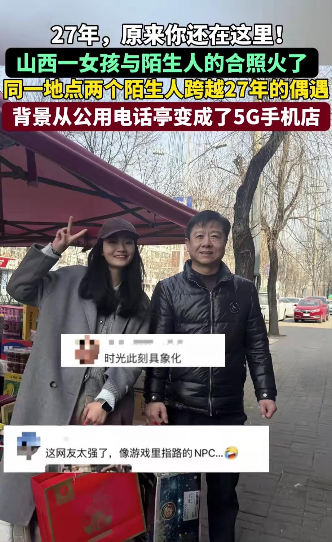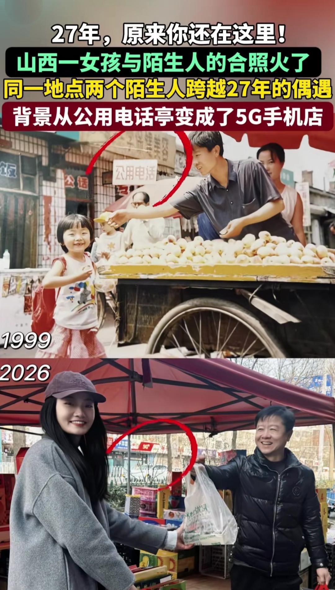 谁能拒绝这种跨越时光的温柔偶遇啊!山西这张合照直接戳中泪点,两个素不相识的人,隔了整整27年,竟在同一个地方再次同框,缘分这东西真的太奇妙了。 老照片里的背景还是老式公用电话亭,那是一代人的青春记忆,如今再拍,身后早已变成了5G手机店。不过二十多年,身边的光景换了模样,可这份不期而遇的美好,却一点没变。 时光匆匆,岁月留痕,从电话亭到5G店,变的是日新月异的生活,不变的是人间的小美好。一张合照,藏着时光的温度,也藏着生活里的小幸运,这样的缘分,真的太让人羡慕了。
