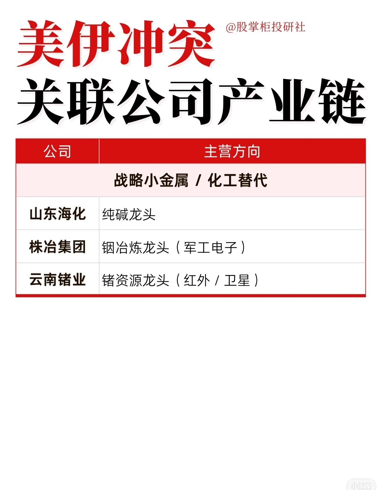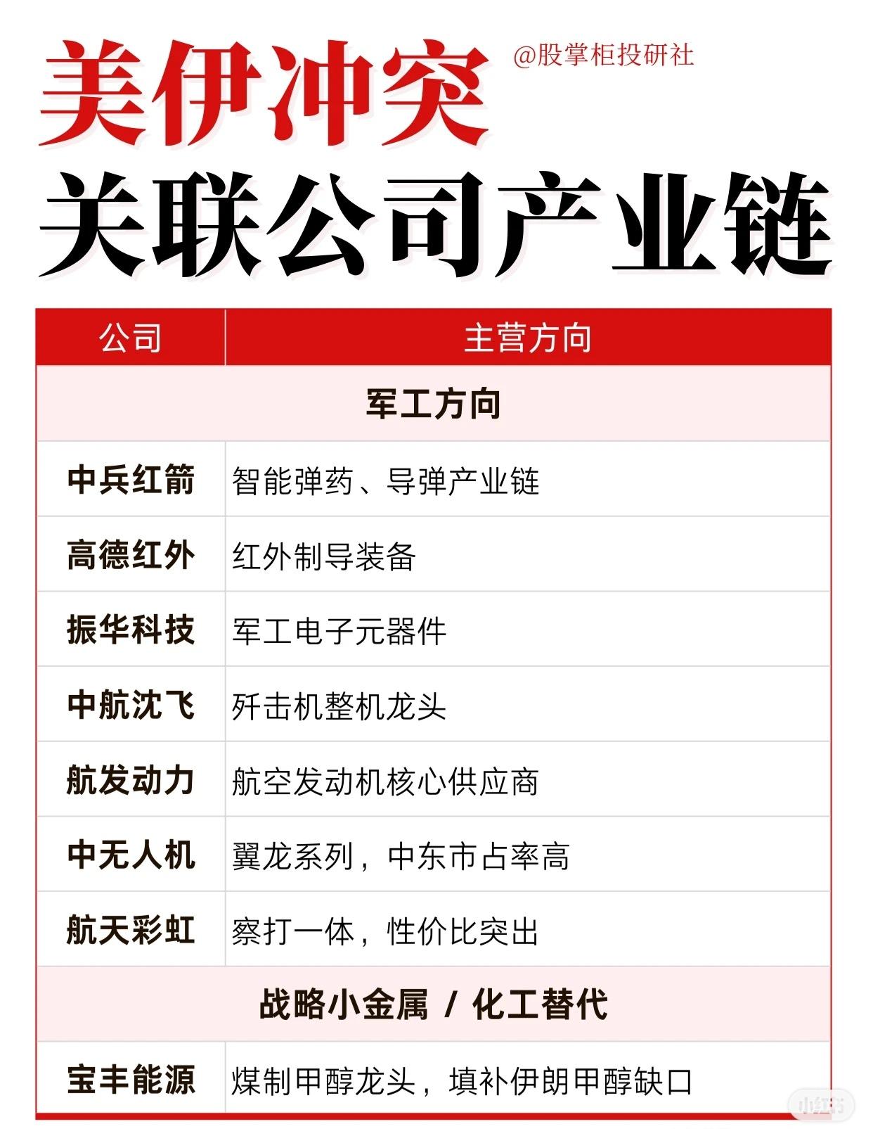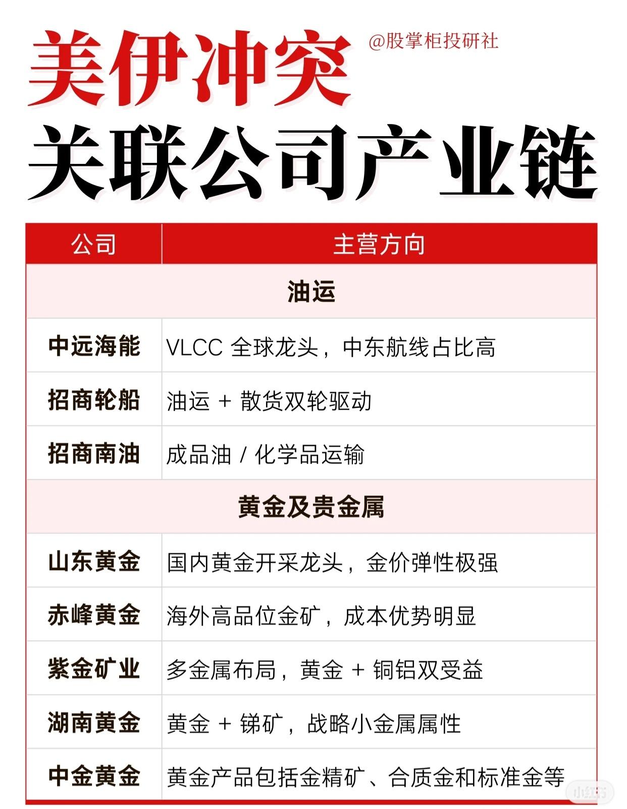 美伊冲突关联公司产业链可分为五大板块: 1. 上游油气开采:中国海油、中国石油、中曼石油、广汇能源。 2. 油服与设备:中海油服、杰瑞股份、石化油服、通源石油。 3. 油运:中远海能、招商轮船、招商南油。 4. 黄金及贵金属:山东黄金、赤峰黄金、紫金矿业、湖南黄金、中金黄金。 5. 军工方向:中兵红箭、高德红外、振华科技、中航沈飞、航发动力、中无人机、航天彩虹。 6. 战略小金属/化工替代:宝丰能源、山东海化、株冶集团、云南锗业。 这些公司分别在油气、运输、贵金属、军工及关键材料领域具备业务优势,有望受美伊冲突影响。