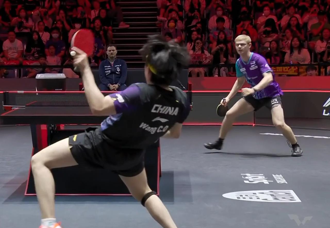 坏了!王楚钦场面被动,不会爆冷吧! 开局两人都接不好对方发球, 王楚钦连摆高3个, 都被小布抢攻成功。 王楚钦发球抢攻也赢了3个! 两人局面相当, 两人一路胶着, 打到了10:10, 小布的远台能力很强, 而且直板反手拉出了球带着弧度, 很难接。 侯英超说: 一定要把节奏慢下来, 赢他没问题!