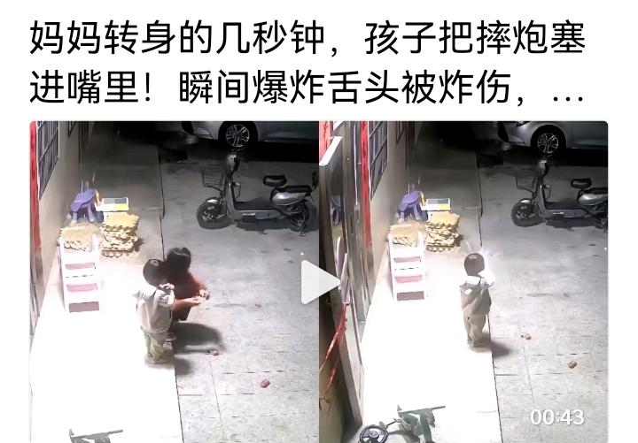 妈妈转身几秒,孩子把摔炮塞进嘴里炸伤舌头! 监控里的画面,看得人头皮发麻:妈妈刚转身的几秒钟,年幼的孩子竟把摔炮当成糖果,一把塞进嘴里啃咬。 下一秒,摔炮在嘴里瞬间爆炸,孩子的舌头被炸伤,所幸伤势不算严重。 很多家长觉得“摔炮没那么危险”“就玩一小会儿”,可对孩子来说,没有“安全的疏忽”。 那些看似不起眼的小玩具、小零食,都可能变成致命的陷阱。 别等意外发生才追悔莫及。看护孩子时务必全程专注,坚决不让孩子接触、误食易燃易爆小玩具,别让一时的大意,酿成无法挽回的悲剧。 社会百态 安全