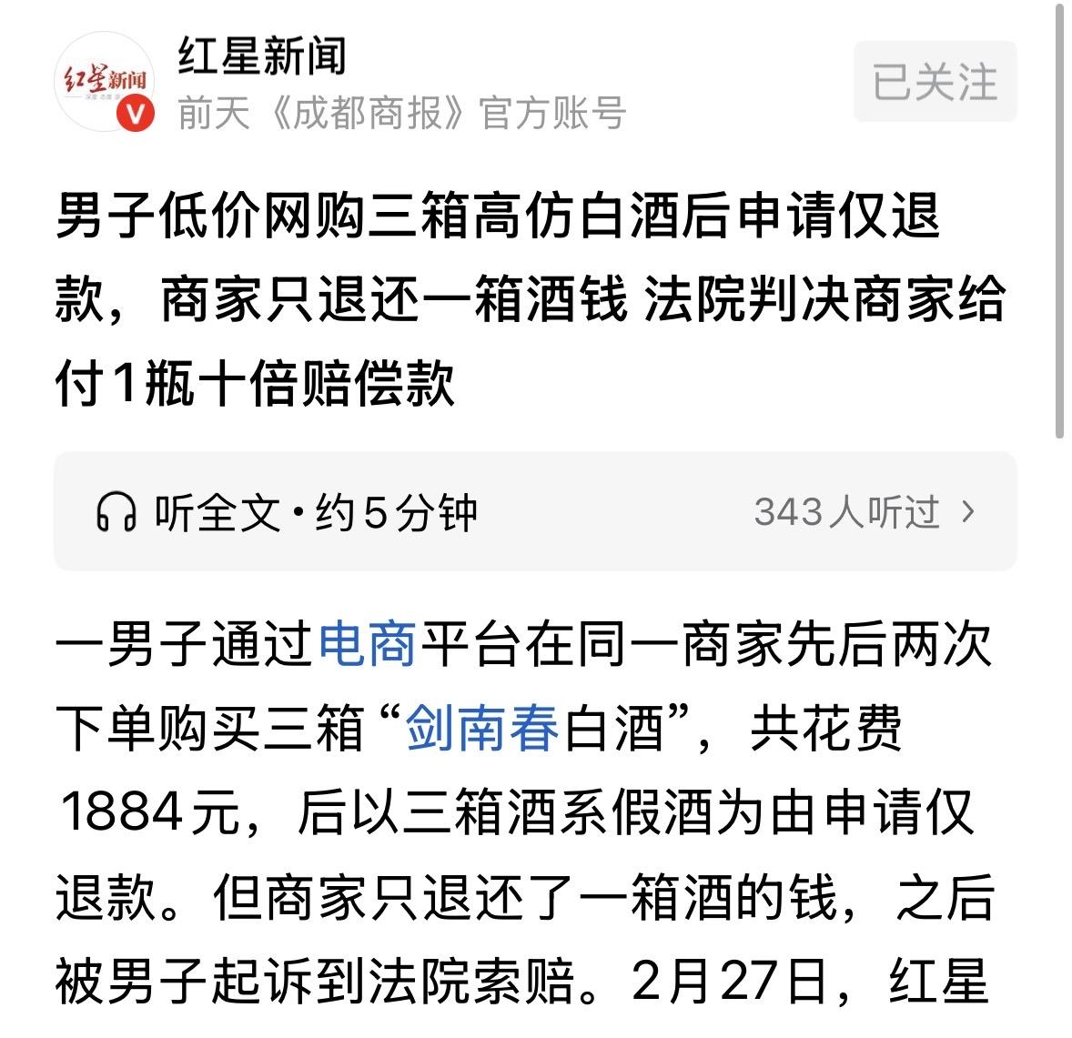 安徽无为,男子在网上花628元买了箱剑南春,商家意味深长地问他:知道是什么酒吧?男子没理会,收到货又花1256元买了两箱。三箱到手后,男子直接以买到假酒为由申请仅退款,见商家只退了一箱的钱就没了下文,男子干脆诉至法院,要求退一赔十。法庭上,商家一句话暴露了男子的真实身份。 2025年6月,李某在网上买酒,他看到一家名店铺卖“剑南春白酒”,标题旁的小字引起了他的注意。 小字写着:品质过硬,口感相似百分之90。 懂行的都知道,这行字基本就是在暗示:这是高仿,但也是好货。 李某直接下单了一箱,总共6瓶,付了628元。 付款后,商家江某在聊天框里发了一句意味深长的话:知道是什么酒吧? 李某心里跟明镜似的,但他选择了沉默,没回复。 三天后,酒到了,李某验了货,心里有了底。 6月16号,他杀了个回马枪,一口气又下单了两箱,这次花了1256元。 几天后收到货,李某直接在聊天窗口开门见山地问:你家这个是高仿吗? 店主江某倒是实在,也不藏着掖着,回得干脆:是的,不然也不会这么便宜,正品都要480元一瓶了。 拿到这句话,李某立刻向平台申请“仅退款”,意思就是酒我留下,但钱你得退给我。 江某当然不干,但在平台介入下,只退了第一箱的628元,剩下的两箱钱卡住了。 这时候,李某露出了真实目的。他直接把江某告上法院,索赔13816元。 他的理由就是:商家卖假酒,根据法律,得“退一赔十”。 法庭上,江某一肚子苦水。他辩解说:我都明示是高仿了,详情页写了,聊天也说了。这酒市场价480一瓶,我卖100多,他能不知道是假的?再说这人是职业打假的,买了一箱又买两箱,收到货立马就找茬,明显是来讹钱的! 江某还甩出了一个关键证据:李某在近一年里,在全国各地法院有将近60起作为原告的买卖合同纠纷官司。这就是个“职业打假人”,靠这个吃饭的。 法院把前因后果一捋,心里也有数了。 法官认为,从商品页面的暗示到聊天记录的实锤,李某作为一个成年人,绝对知道这酒是假冒伪劣产品。 而且他这职业背景,买酒根本不是为了喝,就是为了找茬索赔。 但是,判决的转折点来了:虽然李某是“知假买假”,虽然他是职业打假,但在食品安全领域,法律并没有禁止这种行为。 卖假酒本身就违法,职业打假在一定程度上能帮市场“排雷”。 不过,法院也没让李某狮子大开口得逞。 法官觉得,你职业打假归职业打假,但法律保护的是消费者的权益。你不能买几十瓶回去囤着或者倒卖,那就超出了生活消费的范畴。 《食品安全法》第148条第2款:生产不符合食品安全标准的食品或者经营明知是不符合食品安全标准的食品,消费者除要求赔偿损失外,还可以向生产者或者经营者要求支付价款十倍或者损失三倍的赔偿金;增加赔偿的金额不足一千元的,为一千元。 这条法律核心逻辑就一句话:只要卖的是不符合安全标准的食品,不管你是不是故意买假,都得“退一赔十”。 在这个案子里,虽然李某是“职业打假人”,也明知是假酒还买,看起来像“钓鱼”,但法律为了严守食品安全底线,依然支持他的索赔权。 因为剑南春属于食品,假酒不仅侵权,更可能危害健康,法律鼓励通过高额赔偿来倒逼商家不敢卖假。 不过,法律保护的是“消费者”,不是“倒爷”。 最终,法院拍了板:考虑到本地普通老百姓的喝酒习惯,认定“一瓶”属于合理生活消费范围。 这一瓶酒按十倍赔,也就是1040元。剩下的17瓶酒,因为是假的,不能再卖害人,必须全部没收交给市场监督管理局处理。 至于没退的那1256元货款,商家得退给李某。 算下来,江某不仅要倒贴2296元,也就是退款加一瓶的赔偿金,还得搭进去18瓶酒,最后还得看着李某把酒交给市监局销毁。 判决书一下来,江某是赔了夫人又折兵,李某虽然没拿到一万多的巨额赔偿,但也小赚了一笔。 对此,你怎么看? 关注@运良说法 学法律知识不迷路
