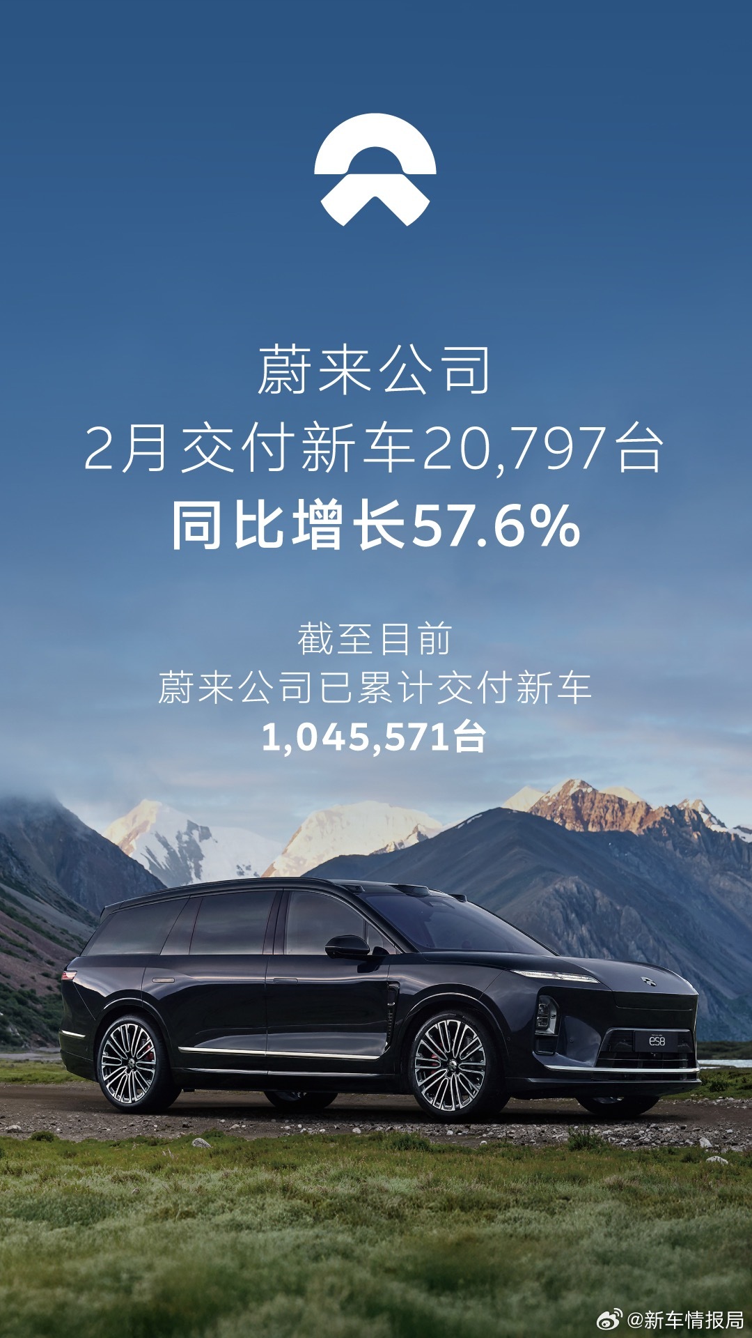 蔚来汽车2月交付新车超2万台新车情报局 公布最新销量数据,2026年2月,蔚来公司交付新车20,797台,同比增长57.6%。截至目前,蔚来公司已累计交付新车1,045,571台。全新ES8历时160天完成第70,000台新车交付。
