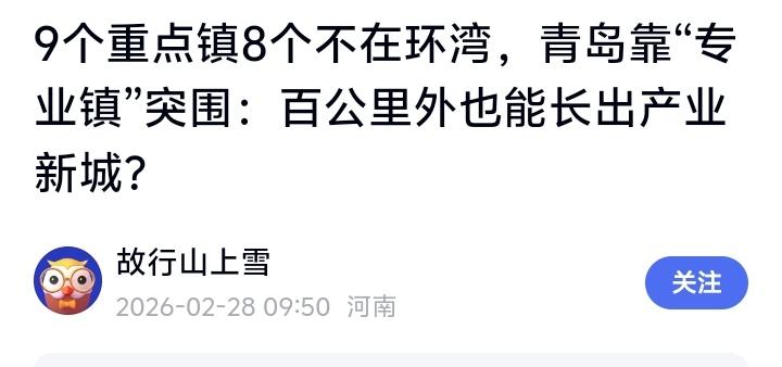 青岛惊天布局曝光!9大“王牌镇”竟有8个远离海岸线,百公里外荒野崛起超级产业城,背后暗藏山东逆袭终极野心! 打开青岛最新规划图,你会震惊地发现——那些被寄予厚望的未来增长极,竟然纷纷躲开了繁华的环湾地带。这绝非偶然,而是一场精心策划的城市革命。当别的城市还在拼命“摊大饼”,青岛已经悄悄把棋子撒向了远方。 泊里镇离主城上百公里,却矗立起氢能产业园与新材料基地,总投资超140亿的产业群在这里野蛮生长。这里没有市区的霓虹,却有港口吞吐的轰鸣;没有密集的楼宇,却有着连片的标准厂房。它证明了一件事:产业自己能造城。 田横镇更是绝地反击的典范。远离都市喧嚣,却坐拥整个海洋的馈赠。海洋装备制造、海上光伏、水产种苗……这些需要广阔空间与场景的产业,在这里找到了真正的舞台。它的崛起宣告:海洋经济不是沿海市区的专利。 而琅琊镇则走了一条风花雪月的实干路。去年120万游客涌入,带来超2亿元旅游收入。这里不拼工业产值,拼的是文化底蕴与生态吸引力。它让小镇明白:用好一座古台、一片海湾,就能养活一方人。 更值得玩味的是平度南墅镇、莱西店埠镇这些“内陆选手”。它们没有海岸线,却各自在石墨新材料、航空配套等细分领域扎下深根。这透露出的信号残酷而清晰:每个镇都必须找到自己的唯一性,否则就会被遗忘。 专业化,成了这批小镇唯一的生路。过去那种“小而全”的发展模式被彻底抛弃,取而代之的是“窄而深”的产业掘进。就像明村镇抓住潍烟高铁做物流,新河镇锁定化工基地定位——它们不是在发展,而是在求生。 但隐患也随之浮出水面。当产业在百公里外开花,生活在市区的人愿意过去吗?医疗、教育、商业这些软配套,能否跟得上厂房建设的速度?如果年轻人去了却留不下,这些产业新城会不会沦为“白天机器响,晚上空城荡”的尴尬存在? 青岛的野心显然不止于此。它要的不是几个卫星镇,而是一个能够自我造血、多点爆发的城市集群。环湾区域做精做优,外围城镇做大做强——这盘棋的关键,在于能否用高速轨道与智慧网络,把这些散落的珍珠串成项链。 当资源真正敢于流向远方,城市才真正突破了空间的诅咒。青岛这场豪赌,赌的是产业先行能带动人口聚集,赌的是专业镇能长出城市功能。这不仅是青岛的突围,更是无数中小城镇的未来预演。 青岛产业突围 专业镇崛起 城市新战略 (来源:根据青岛市城镇体系规划及各区市产业报告综合梳理)