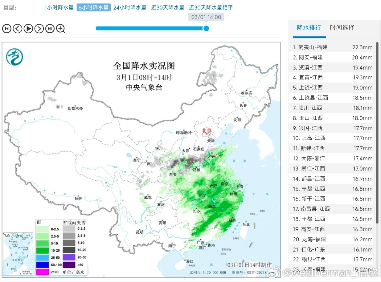 【雨雪】今天08-14时,因为低涡切变线的影响,中东部继续出现大范围降水。福建武夷山22.3毫米,排在6小时降水榜第一。甘肃陕西山西河南山东河北部分地区出现降雪。从逐小时雨雪相态看,山东西北部午后雪转雨。但今晚随着气温下降,可能再次转雪。今天上午中央气象台继续发布暴雪蓝色预警: