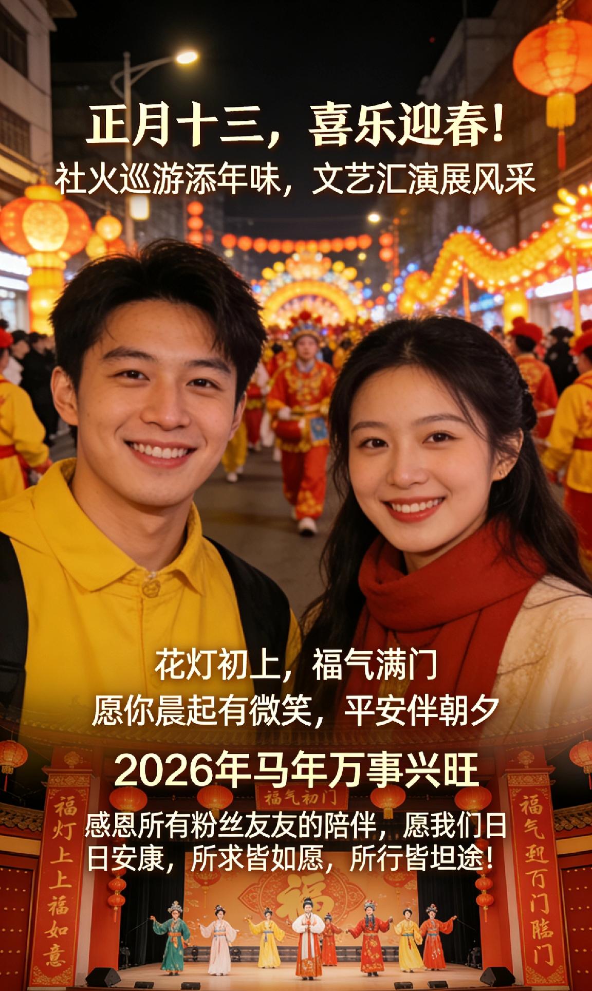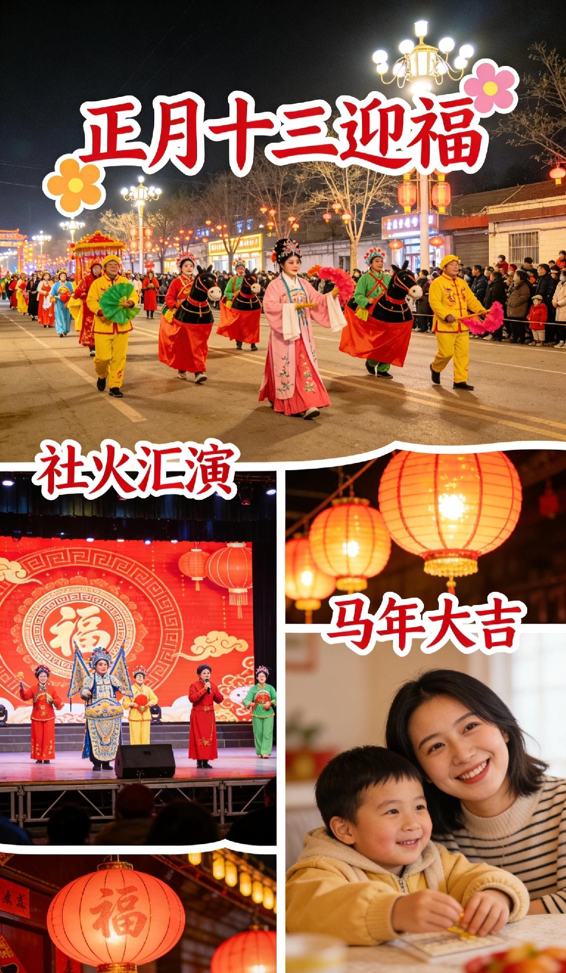 正月十三,喜乐迎春!社火巡游添年味,文艺汇演展风采,花灯初上,福气满门。愿你晨起有微笑,平安伴朝夕,马年万事兴旺。感恩所有粉丝友友的陪伴,愿我们日日安康,所求皆如愿,所行皆坦途! 🌸正月十三迎福 社火汇演