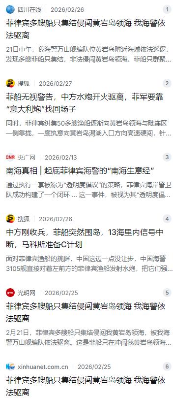 开炮真管用!中国海警船果断开炮,菲律宾50多艘舰船立即鸟兽散,夺命而逃! 麻烦看官老爷们右上角点击一下“关注”,既方便您进行讨论和分享,又能给您带来不一样的参与感,感谢您的支持! 南海那边又热闹了一把,不过结局跟以前一样,菲律宾那边折腾了半天,最后还是灰溜溜地跑了。事情发生在2月21号到24号,这次菲律宾那边可以说是下了“血本”,不仅派出了海警船和渔业部门的公务船,还煽动了一大群渔船,前前后后凑了50多艘,从好几个方向朝着咱们的黄岩岛就摸过来了。 这阵仗看着挺唬人,其实就是典型的“草台班子”战术,想用这些渔船当掩护,搞什么“人海战术”和“碰瓷”直播。菲律宾的几艘海警船比如4409舰,躲在渔船后面当“指挥车”,撺掇着那些小渔船往黄岩岛的潟湖入口冲,自己则打算趁乱往里挤。船上还带着一堆记者和摄影师,镜头盖早就打开了,就等着抓拍咱们海警“欺负人”的画面,好回去剪辑一下,找他们的主子卖惨要钱。 但他们这点小算盘,早就被咱们看穿了。中国海警3105舰和附近的兄弟船早就严阵以待,在关键位置守得死死的。面对菲方船只的一再挑衅和无视警告,咱们的海警兄弟保持了极大的专业和克制,但该出手时绝不含糊。眼看着几条菲律宾渔船不管不顾地加速冲过来,甚至有撞击的危险动作,海警3105舰果断亮出了“大水管”——高压水炮。 这可不是闹着玩的,白色的水柱像条巨龙一样精准地压了过去,巨大的冲击力直接让那些试图硬闯的渔船原地打转,根本顶不住。刚才还气势汹汹往前冲的那股劲儿,瞬间就被打没了,剩下的只有掉头就跑的份儿。这水炮一响,效果立竿见影,那50多艘船顿时作鸟兽散,跑得那叫一个快,生怕跑慢了被浇成落汤鸡。 有意思的是,就在这水炮交锋的同时,天上和水下还有一场看不见的较量。这次菲律宾为了能实时直播、方便指挥,特意在船上装了民用“星链”设备,指望靠这个跟后方保持联系。可他们一靠近黄岩岛附近海域,就发现不对劲了,船上的通讯信号直接归零,“星链”屏幕上弹出了“无法使用”的提示。 这一下,不管是船队之间的沟通,还是想给后方传素材搞直播,全都抓了瞎。据说他们的飞机也遭遇了同样的情况,只要飞进黄岩岛附近13海里到15海里,通讯立马中断,成了“睁眼瞎”。这其实就是咱们国家在这片区域构建的立体防御网在起作用,别管你什么民用黑科技,到了咱们的主场,是龙你得盘着,是虎你得卧着,电磁空间的主权同样不容侵犯。 没了通讯,又顶不住水炮,菲律宾这次精心策划的“混合战术”还没真正展开,就彻底崩盘了。他们的海警船和公务船一看情况不对,根本顾不上那些被当枪使的渔船,自己先掉头撤离了。这场闹剧从21号开始发酵,到24号晚上基本就收场了。 其实稍微了解点内情的人都明白,菲律宾马科斯政府这么频繁地在南海搞事,根本目的就不在海上。这出戏是演给国内看的,更是演给美国等外部势力看的。他们把这套把戏叫做“透明度倡议”,说白了就是故意制造摩擦、拍下视频、然后拿到国际上卖惨,再把卖惨换来的政治资本,拿去跟国会要钱,买更多的装备,甚至转化成某些人升官发财的垫脚石。 他们的海警发言人能从一个管人事的行政官员摇身一变成为准将,靠的不就是天天在网上发这些掐头去尾的视频、跟咱们的外交官打嘴仗吗?只不过这种拿国家安全当生意、把普通渔民当炮灰的做法,终究不是长久之计。咱们的态度一直很明确,黄岩岛及其附属海域自古以来就是中国的固有领土,这一点没有任何讨价还价的余地。 不管你来多少条船,玩多少花招,咱们都有足够的能力和决心维护国家主权和海洋权益。这次水炮驱离也好,电磁压制也罢,都只是依法维权的手段而已。奉劝菲律宾某些人,别老打那些不切实际的算盘,域外国家的航母再大,也撑不起你破坏地区和平稳定的野心。老老实实回到对话谈判的轨道上来,才是唯一的正确出路。