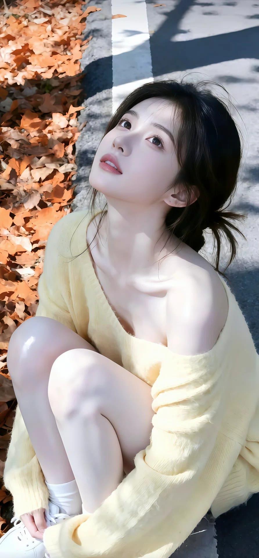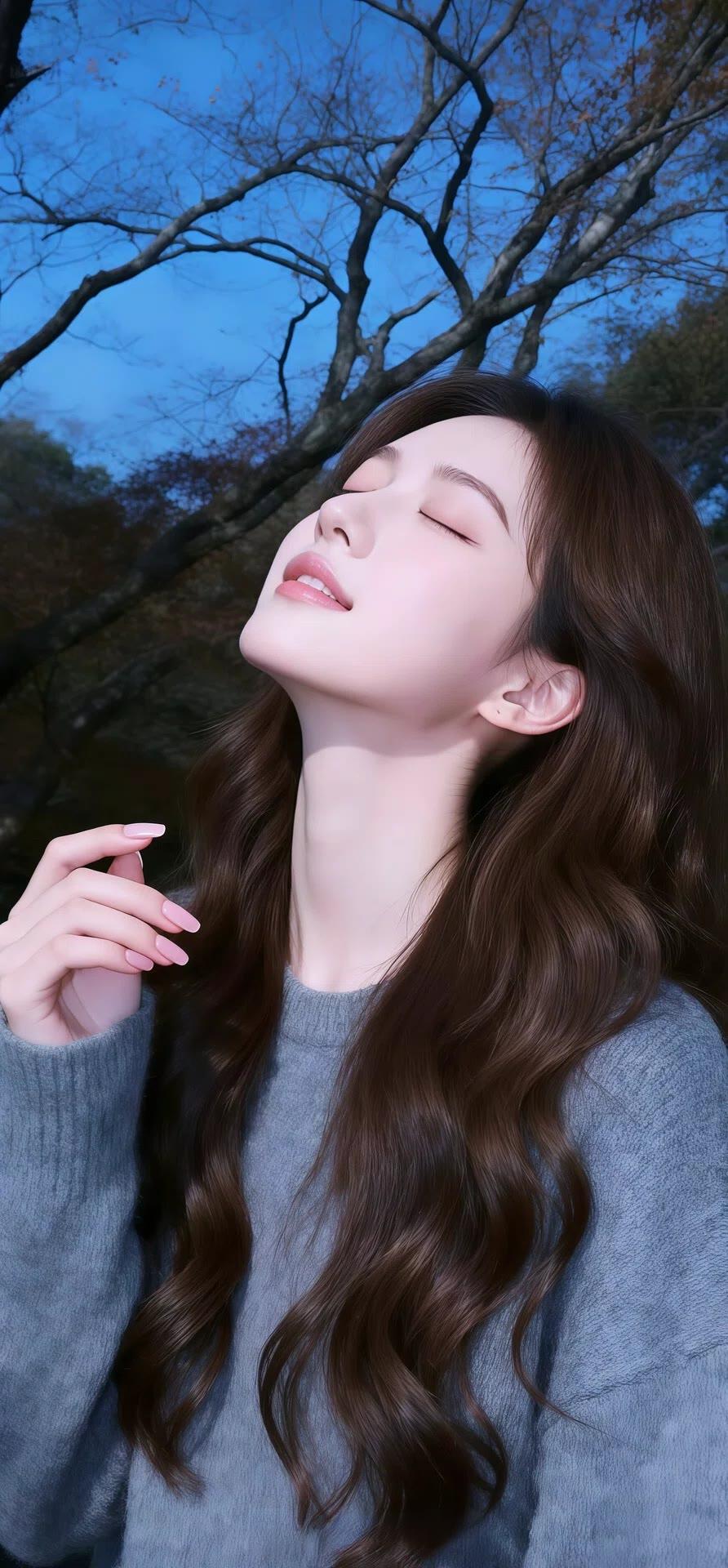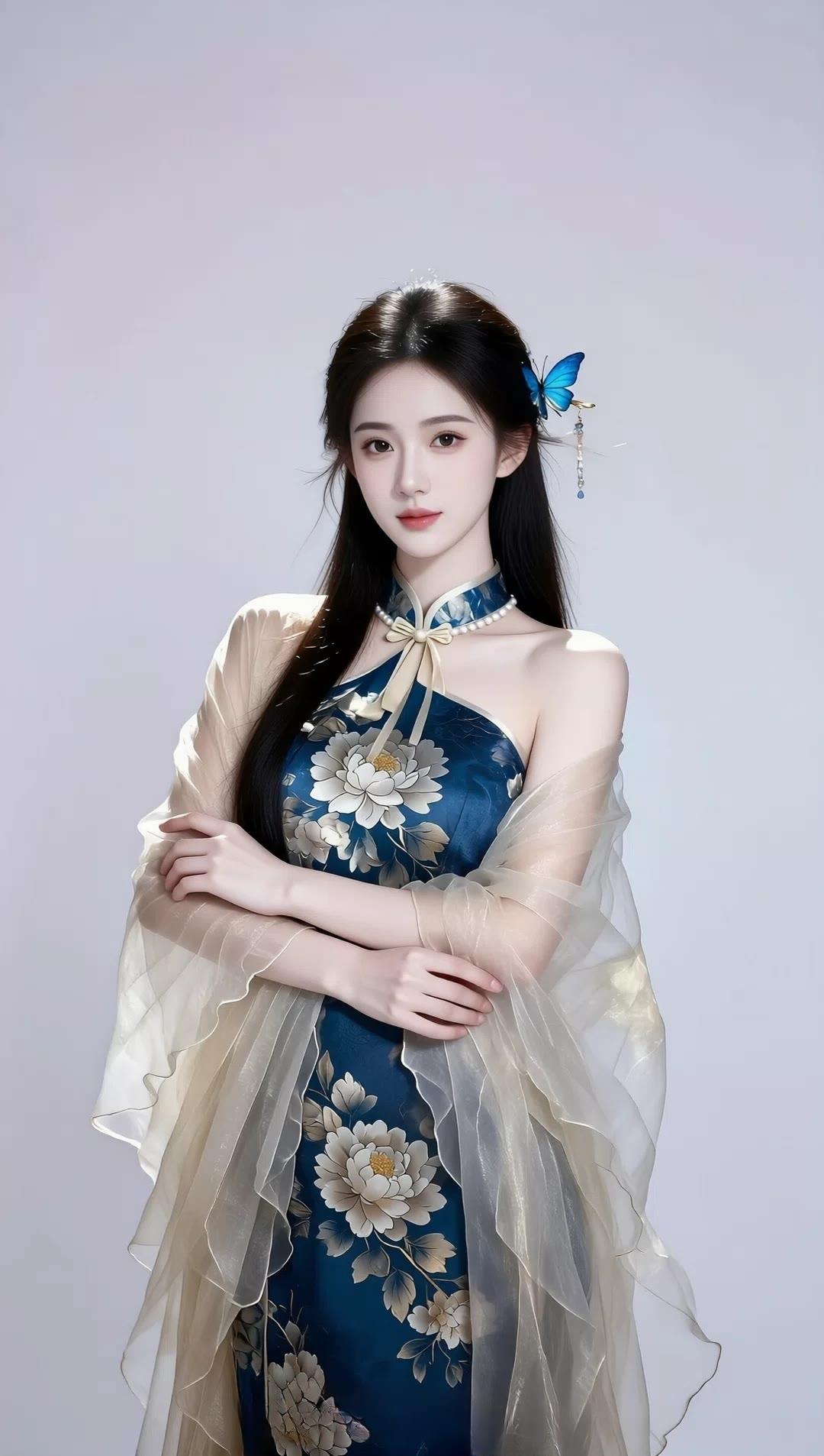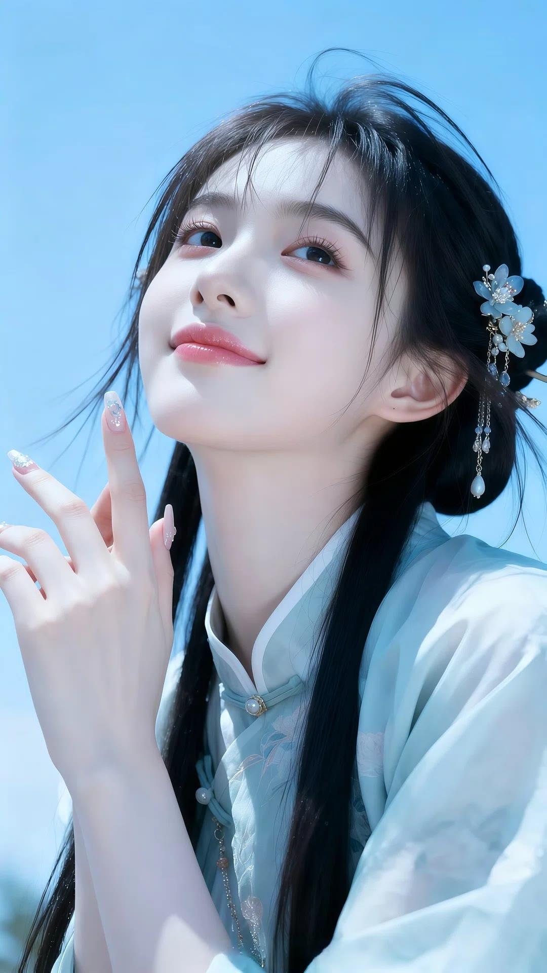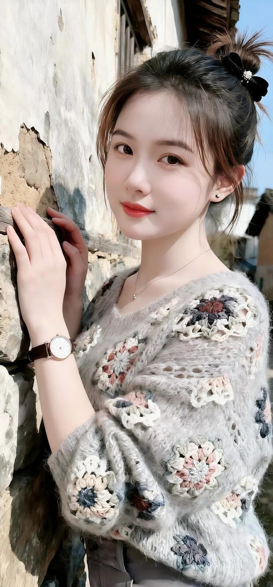 她宛如从画卷中走来的优雅佳人,浅蓝蕾丝裙勾勒出曼妙曲线,针织开衫添了几分温柔。长