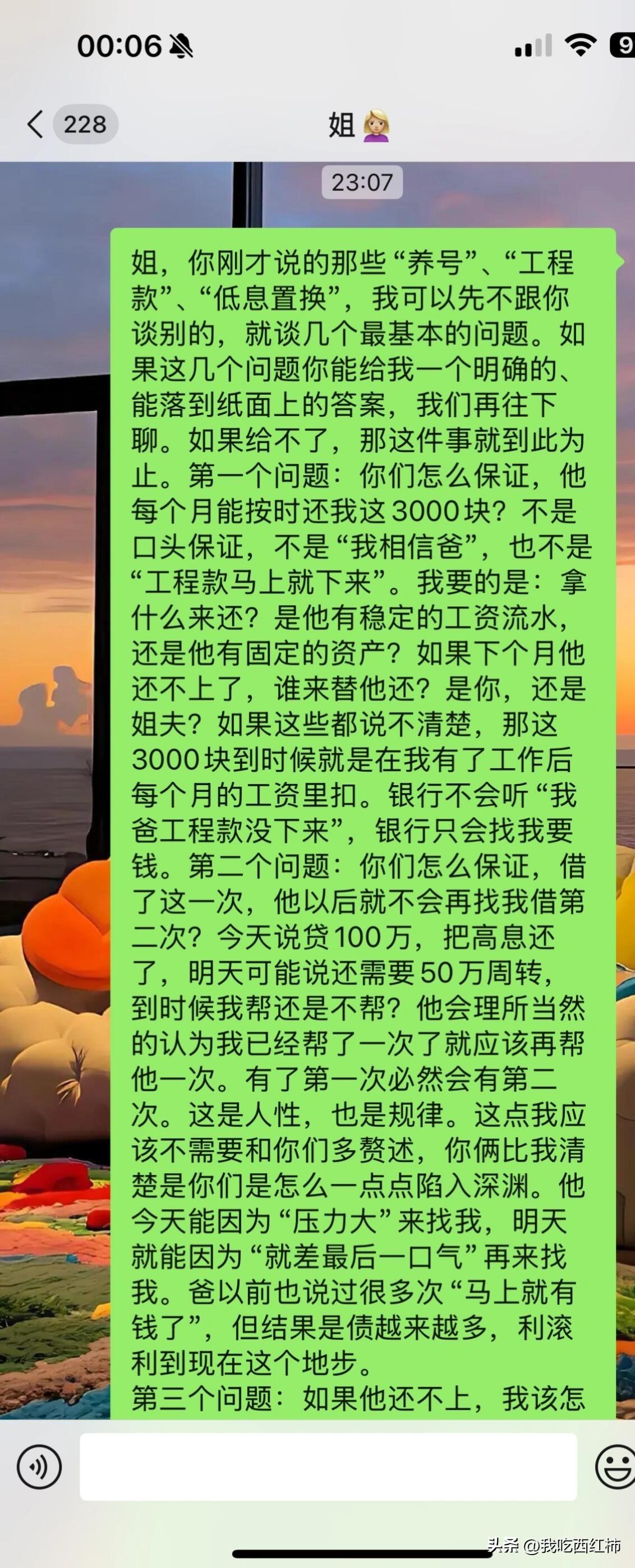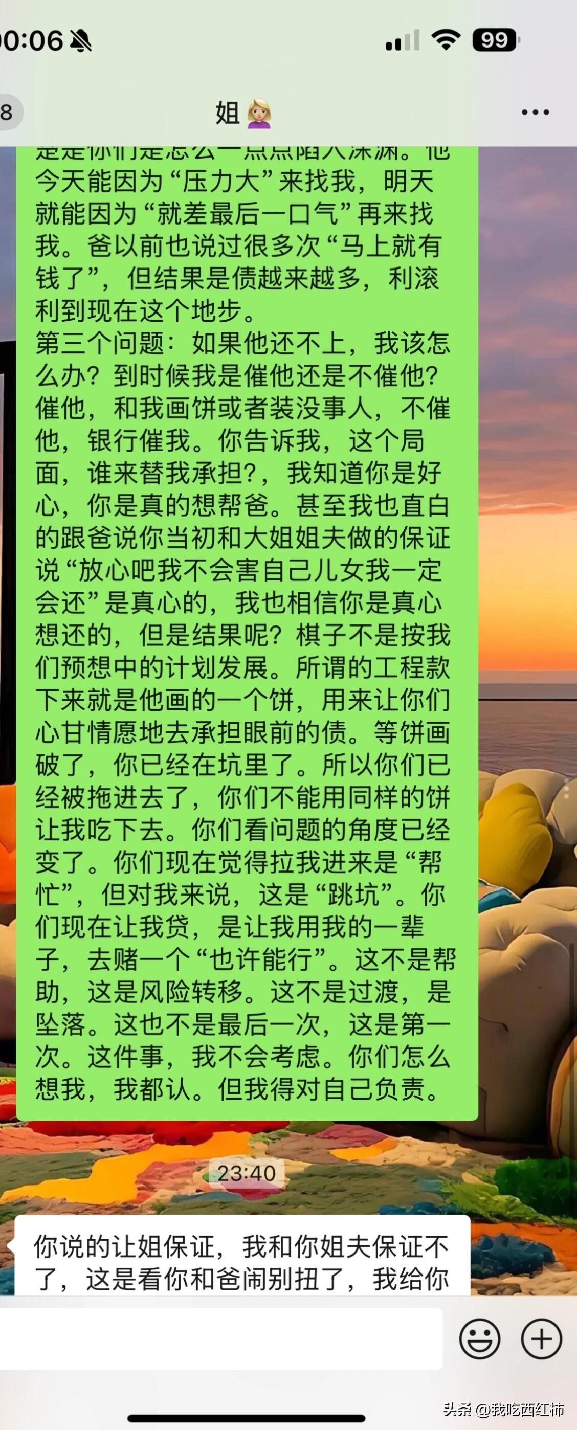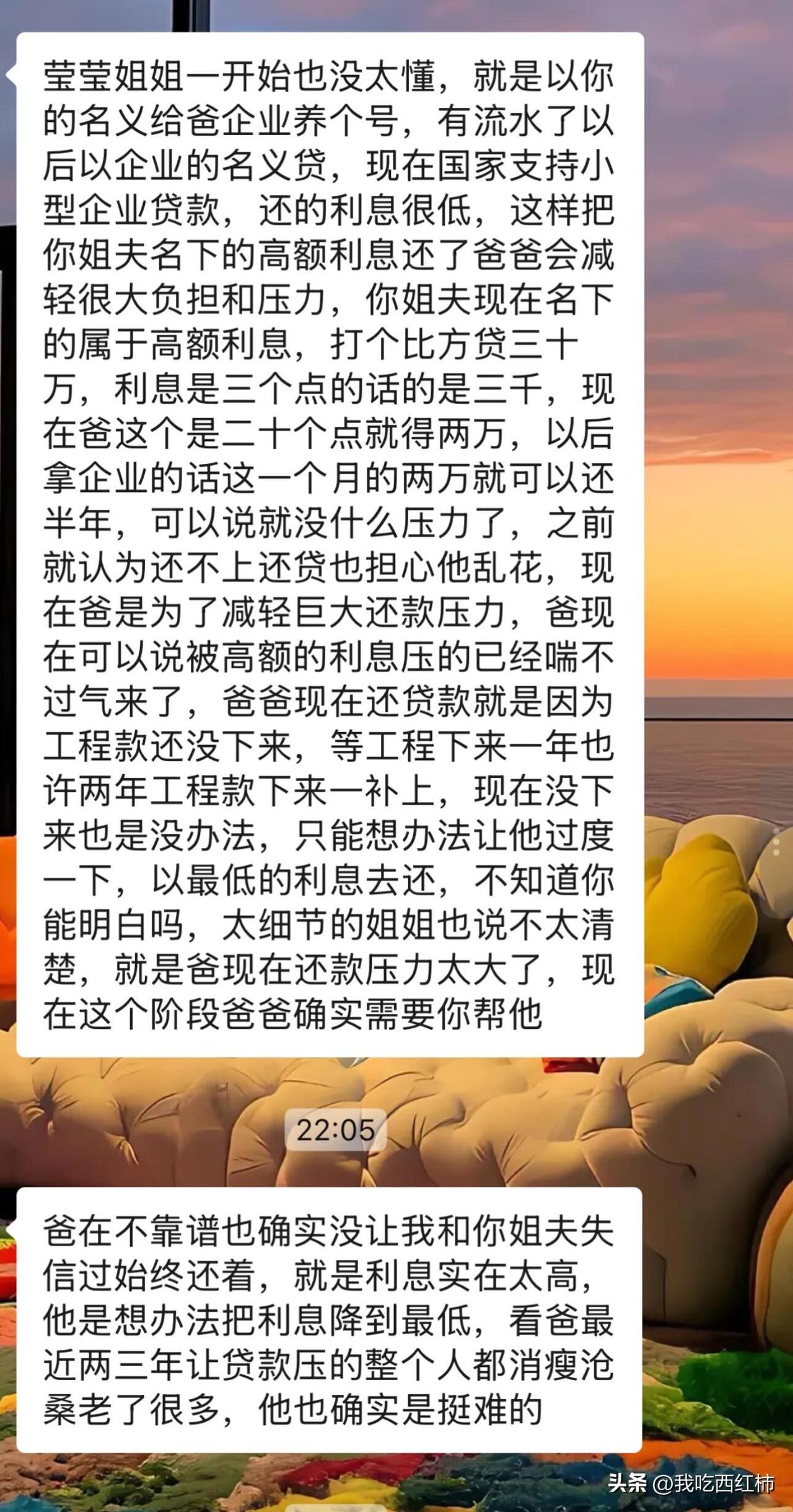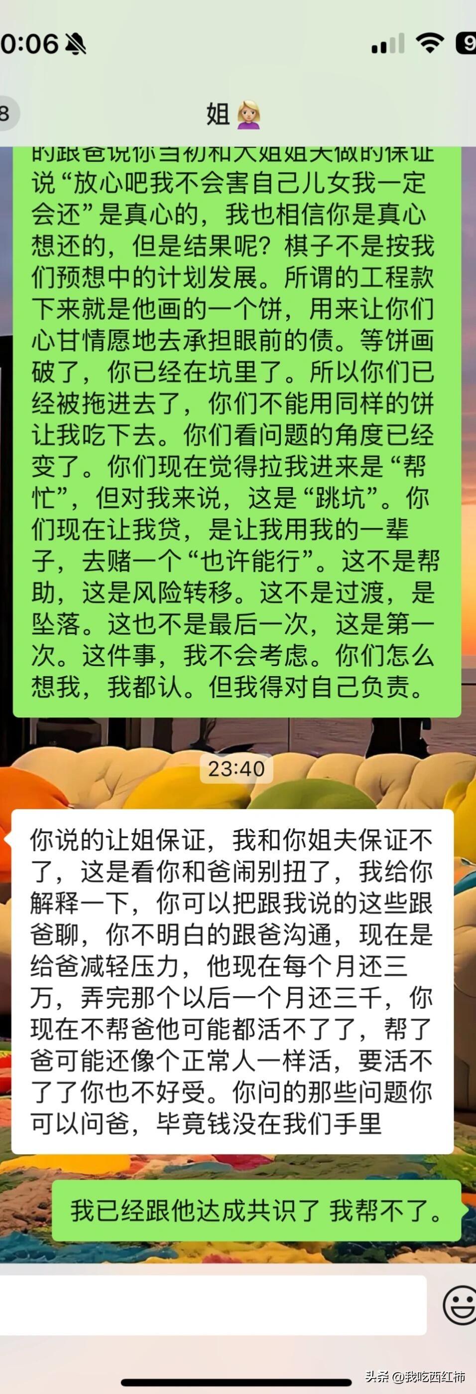 我是不是错了 我爸找我姐姐夫前前后后借贷款200多万,每一次都说马上就会下工程款,说了三年到现在也没有下。再加上前两年基本所有贷款都是还着银行然后不停的买瓷器,他说以后这些瓷器都会回馆的给你展览费,这种一听就离谱的事全家人都拦着他不让买。不听,各种撕疯骂我们,连续买了两年,去年6月不怎么买了因为没钱了。瓷器当然一件没拍出去因为就是假的啊 我家里都是他的瓷器加上地下室全部都是瓷器。他现在资不抵债也没有固定收入还不上。然后我爸找我谈话让我用公积金把他贷款100万帮他养养号。我说我不想弄这些。他阴阳怪气我说当初上学的时候你怎么不知道别找我要钱呢现在需要你了你这样。说死了也不用你。然后我跟我姐说了这事 用ai编辑的我想说的话。我一开始以为她是赞同我的毕竟她就是听了他的话一步步走进深渊里经常和我说他多不好多不靠谱。结果她突然换了一套说辞。她的意思是用小微企业贷,虽然每个月利息少了但是期限只有一年 明年这个时候要一次性还100万,他怎么可能还的上拿什么还 大概率还是接着贷 最后说爸如果活不了就是我的罪过。我是没想到她会说出这句话的,因为这个家里我和大姐是关系最好的无话不说。突然因为这事就这样了。我是不是真的太冷血了,其实我也很心疼我姐姐夫 当初就是听我爸的那一套说辞不会害他们之类的工程款马上就下来 利滚利不停的贷到今天这样。她俩说白了基本老底都造完了