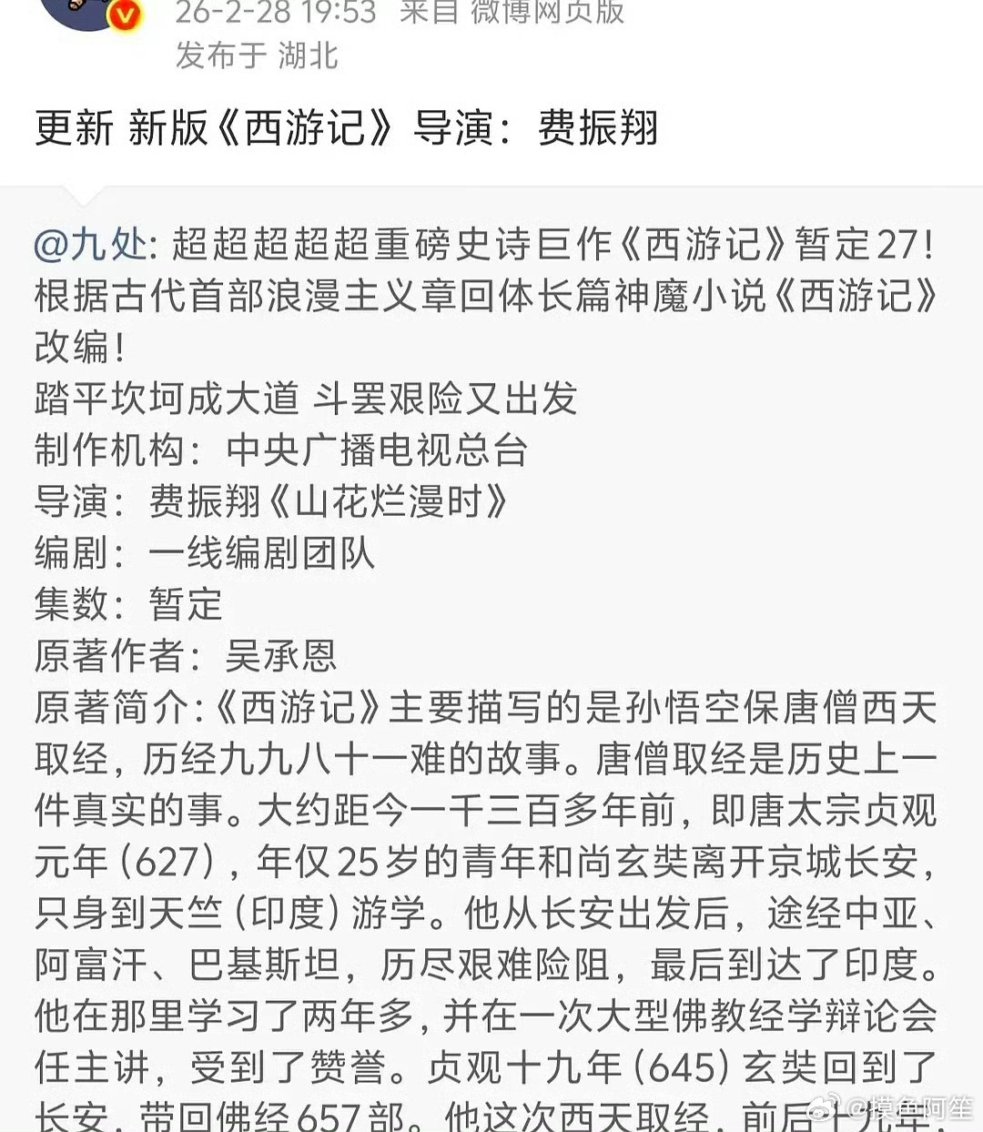 费振翔要拍西游记了……冷知识,之前浙江卫视拍过一版吐槽特别多的西游记,里面那个被吐槽特别多的孙悟空就是他演的