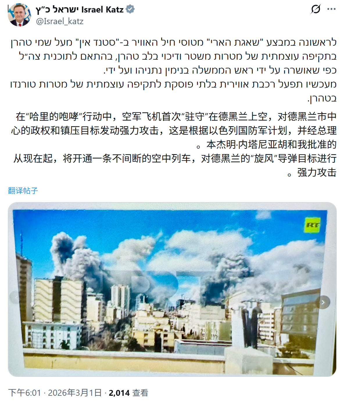 以色列国防部长称以军战机首次在伊朗首都德黑兰上空飞行:在“雄狮咆哮”行动中,空军战机首次以“防区内(stand-in)”方式在德黑兰上空飞行,对德黑兰市中心的政权目标及镇压机构目标实施了强力打击。这是根据以色列国防军的作战计划执行的,并已获得总理本雅明·内塔尼亚胡及我本人的批准。从现在起,将启动一条持续不断的“空中通道”,对德黑兰的“龙卷风式”目标实施强力打击。美伊以冲突