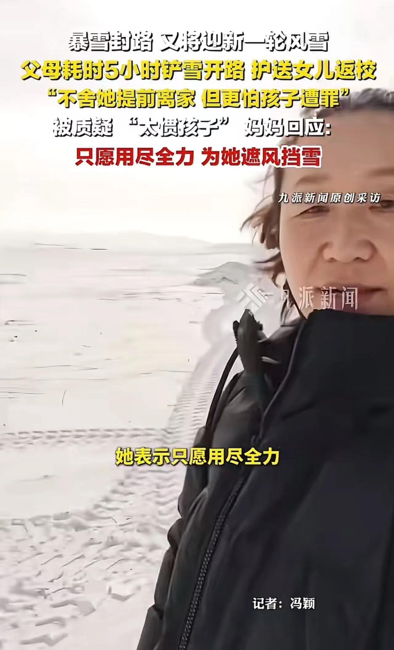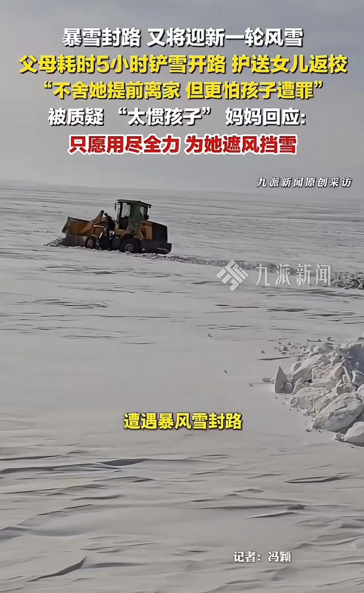 内蒙古,暴风雪封路,“父母铲5小时雪送女儿返校”被骂太溺爱?父母硬核回应:“我不惯自家孩子,难道惯别人?只愿用尽全力为孩子遮风挡雨。” 2026年2月28日的乌拉盖草原,没有所谓的地平线,天地被狂风搅成了一锅混沌的白粥。 早上8点,一台铲车轰隆隆地撕开过腰深的雪墙。 驾驶室里的男人死死咬着牙,方向盘在粗粝的手里猛打。他身后贴着一辆皮卡,妻子握着方向盘,双眼像雷达一样扫视着车两侧随时可能吞噬车轮的冰雪暗沟。车厢后座,坐着他们读大二的女儿和返校的行李箱。 这根本不是什么温馨的送别,而是一场重型机械参与的硬核破冰突围。平时踩一脚油门十几分钟就能开完的七八里路,这两辆车像两头陷入泥沼的老牛,生生啃了5个小时。 直到下午1点,皮卡的轮胎才终于咬住了已经被清理过的主干道柏油皮。把女儿塞进舅舅的车、发往数百公里外的机场后,夫妻俩调转车头。又是长达3个多小时的逆风空车前行,等他们重新摸回家门时,早上刚豁开的雪道,早就被风雪彻底抹平了。 这段视频在三月的互联网上炸开了锅。你猜怎么着?键盘敲击声里飘满了一种高高在上的道德审判。有人敲着屏幕冷笑,都大二了还得爹妈开铲车送,这不就是惯出来的巨婴吗?晚几天开学天能塌下来? 这话说得多轻巧,就像他们平时点外卖嫌慢时发牢骚一样随便。他们根本不懂内蒙古雪原上的生存法则,那是用命丈量出来的刻度。气象台的警报早就挂红了,再过两天,也就是3月3日,9级阵风裹挟的“白毛风”就要砸下来。 能见度不到两米,一旦封路,那就是整整十几天被死死按在暴风雪的牢笼里。距离机场几百公里,如果不在28号这个稍纵即逝的窗口期强行冲出去,这趟返校行程就得原地报废。女孩学校的报到期限是钉死的,这根本不是商量能不能请假的问题。 这是一种精准的灾难风险阻断。他们是在大自然的闸门彻底落下前,抢出了女儿回归现代文明的安全通道。可互联网的道德高地向来喜欢把苦难浪漫化。 他们把在暴风雪里自生自灭等同于“吃苦”,把规避自然不可抗力扣上“溺爱”的屎盆子。真实情况呢?这个大二女孩在学校自己打理所有琐事,寒假在家包揽家务,比绝大多数敲键盘的人都活得利索。 真正的独立从来不是脑子发热去硬刚狂风暴雪,而是有能力不盲目涉险。面对满屏的口诛笔伐,母亲白女士的回应像草原上的风一样硬气。她把话直挺挺地撂在了桌面上:不惯自家孩子难道惯别人?做父母的就是要用尽全力遮风挡雨。 这句话直接撕破了所谓“独立教育”的伪善面具。什么叫过度溺爱?是无原则的纵容,是替孩子揽下所有的对错。但这对乌拉盖草原上的夫妻干了什么?他们在零下几十度的冰天雪地里,用极度透支的体力,生生替孩子蹚出了一条活路。 这叫护航,这叫中式父母不计成本的托底。这五加三个小时的往返拉锯战里,藏着越野级别的亲情逻辑。 当夫妻俩灰头土脸地回到那个再次被大雪封死的家门前时,物理上的道路确实消失了。但这八个小时的轰鸣与风雪,已经在离开的女儿心里,浇筑了一条永远不会结冰的防线。有这种硬核底气兜底的孩子,以后走到哪座城市的哪个风口,都不会轻易被冻僵。
