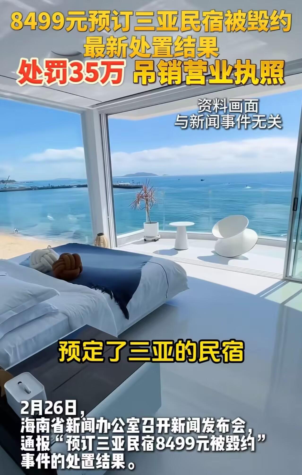 “罚款35万!!!这次海南动真格了!”男子花8499元预订三亚民宿,结果民宿单方面毁约,把房间以更高的价格卖给了别人。男子的行程被毁,气得投诉,现在最新处置结果出来了:处罚35万,吊销营业执照! 2月26日的海南新闻发布会上,电子屏幕上的几组数字格外刺眼。这不是一次旅游人次的例行通报,而是一张带血的罚单。 对其施以35万元顶格处罚,强制吊销营业执照,并将其列入严重失信黑名单。如此举措,旨在彰显监管之威严,捍卫市场秩序之公平公正。这三记重锤,如雷霆般迅猛且结实地砸落在三亚海棠湾一位民宿老板的头上,巨大的冲击力让其在惊愕中难以回神,未来的经营之路似已阴云密布。 你也许会好奇,到底惹了多大的事,能让市场监管局越过雷池下如此狠手?其实事情的起因,不过是一张普普通通的旅游订单。 我们把时针拨回去年底。2025年12月6日,来自北京的游客李先生精准把握时机,成功享受到早鸟价优惠。他的敏锐与果断,为此次出行增添了一份经济实惠的愉悦。他轻刷卡片,8499元的金额瞬间完成支付,就此锁定了海棠湾一套精致的四居室民宿。那民宿似在静谧中等待着他开启一段别样的旅居时光。 租期算得极为精细,从今年1月26日一直住到2月14日。整整19个晚上的跨年假期,全家人连行李单都早早列好了。 这笔买卖原本应该银货两讫。眼瞅着全家人就要上飞机了,老板却打来一个不痛不痒的电话。轻飘飘一句“房子出了点小状况”,便妄图单方面撕毁契约。如此随意之举,全然不顾契约的严肃性与约束力,实在有失妥当。 退钱当然痛快,原路返回绝不拖泥带水。实际上,老板心中的小算盘早已拨弄得“噼啪”作响。他表面不动声色,内心却在精打细算,为着自身的利益,谋划着每一步棋。被激怒的李先生挂了电话,反手点开预订软件。 就在1月25日这天,那套刚刚被号称“没法住”的屋子,大摇大摆地重新挂牌上架。只不过标价彻底变了脸,数字暴涨到了三四万元。 看到了吧?哪有什么房屋故障,无非是春节前夕三亚房源极度紧缺。目睹他人动辄获利数万,这位民宿老板的内心再也无法平静,嫉妒的火焰在胸膛熊熊燃烧,他彻底红了眼,贪婪与不甘在心底肆意蔓延。 我们来算一笔绝情的经济账。抛开道德遮羞布,为何这些年违约毁单的龌龊事屡见不鲜?究其根本缘由,乃是利润率之高达到了令人咋舌的程度,这般离谱的利润率,成为问题背后的关键所在。 原来那一套老玩法里,游客维权撑死也就是走民事索赔的“退一赔三”。满打满算,这家商家最多掏出两万五千块钱当赔款。 可你别忘了,那套房在春节期间能重新卖出将近四万的天价!扣掉这区区两万五的赔款,商家的兜里居然还能净剩一万多纯利润。 这哪是罚款?这简直就是一张稳赚不赔的投资保单。只要商家脸皮够厚,违法套利就成了一个低风险的暴利模型。 李先生没有惯着这种恶臭风气。他果断拒绝了私下了难的提议,直接把所有截图打包,按下了向官方投诉的举报键。 三亚方面的响应速度这次透着浓浓的危机感。2月13日,海棠区旅游协会率先下场。官方的思路很明确,先稳住无家可归的游客再说。 “三亚放心游”平台上的资金池发挥了效用。先行预赔付机制即刻启动,真真切切地拿出资金,以切实行动为遭遇困境的李先生兜底,及时止损,尽显担当。 柔性的资金安抚刚刚落地,硬性的行政铁腕紧随其后。时至今年2月26日,省级市场监督管理局全面接管相关事务。自此,监管力量深度介入,为市场稳定有序筑牢坚实防线。 执法者这次根本没按常理出牌。他们利落地绕开了那套软绵绵的民事调解流程,精准抓住了“恶意毁约换高价”的关键铁证。 这就是那张35万元天价罚单的真实来历。这一招极其致命,它是标准降维打击,彻底把那条“违法稳赚”的公式砸了个稀巴烂。 吊销营业执照,无疑是一张无情的商业“死亡判决书”。它宛如一记重锤,直接敲碎商家的商业梦,让商家在市场的舞台上瞬间失去了立足之地。这已经不是除夕夜赚多赚少的问题了,而是连在这个牌桌上摸牌的资格都被彻底剥夺。 这座城市在向所有经营者发出极其彪悍的警告。谁敢在春节的客流巅峰期砸这座城的牌子,规则制定者就会毫不犹豫地掀了他的饭碗。 一张账单,两头见血。李先生的春节虽然折腾得够呛,但这笔重金砸出的罚单,却让整个旅游市场的暗礁浮出了水面。被重塑的游戏规则,此刻才刚刚显露威力。