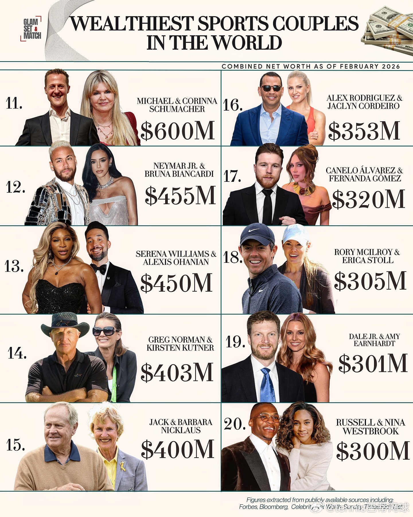 截至2026年2月,前20位最富有的体育夫妇的总净资产已达到了惊人的183.31亿美元,证明了最成功的运动员现在是全球商业巨头。