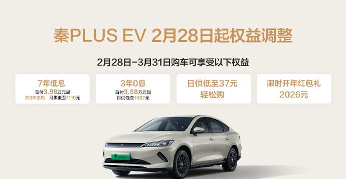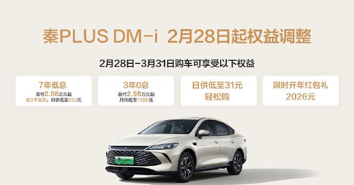 刷到一条消息,说秦PLUS出了个“史上最强金融政策”。 本来对这种促销海报已经有点免疫了,但点进去仔细看了下细则,确实有点东西。 这次不是那种虚晃一枪的“最低首付”,也不是让你两年后一次性还个大几万的套路,实打实的两个点: 一是7年低息,二是3年0息。 对于预算卡得比较紧的刚需家庭或者刚工作不久的年轻人来说,这个组合算是把门槛直接削平了。 简单算了下,如果走3年0息的方案,月供压力会小很多;如果想把还款周期拉长,7年低息那个选项,日供最低能压到31块钱。说实话,现在随便打个车上下班,一天都不止这个数,因此还是很有诚意的。 更直接的是,首付2.98万起就能开走一台冠军家轿。只要你收入相对稳定,就可以提前几年实现“开车自由”。 说起来,比亚迪这波操作挺接地气的。没有去搞那些花里胡哨的配置升级或者限量版噱头,而是直接在支付环节做减法,降低上车门槛。 对于真正需要一辆车来改善生活品质、但手头积蓄不多的家庭来说,这种“低首付+长周期+红包抵扣”的组合,确实是今年开春以来看到比较实在的一次让利。 毕竟,不是每个人都能全款买车,也不是每个人都愿意为了买车把生活质量一下子压到最低。让还款变得更从容一些,让首付不用去借那么多,这比单纯降价几千块有时候更戳人心。 有购车计划的朋友,这一个月的时间窗口确实值得去店里看一看、算一算,毕竟这种金融政策和红包叠加的机会,一年里也碰不上几次。