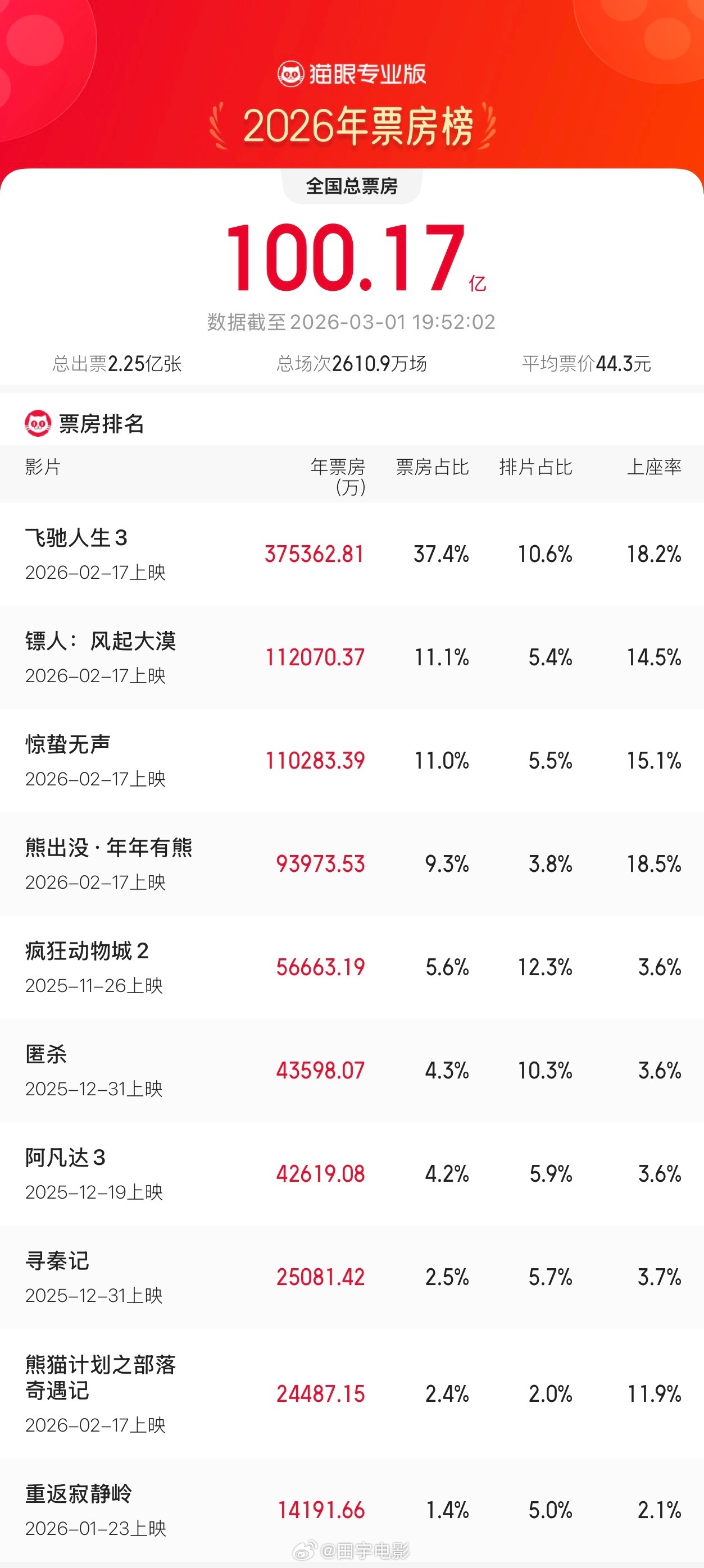 2026年票房破100亿 据猫眼数据专业版统计,截至3月1日18时54分,2026年度总票房已超100亿,前三《飞驰人生3》37.5亿、《镖人:风起大漠》11.2亿、《惊蛰无声》11亿。二三名的竞争还是很激烈,同档期每年的情况不一样,只是没想到今年《飞3》的势头会碾压其他几部春节新片。
