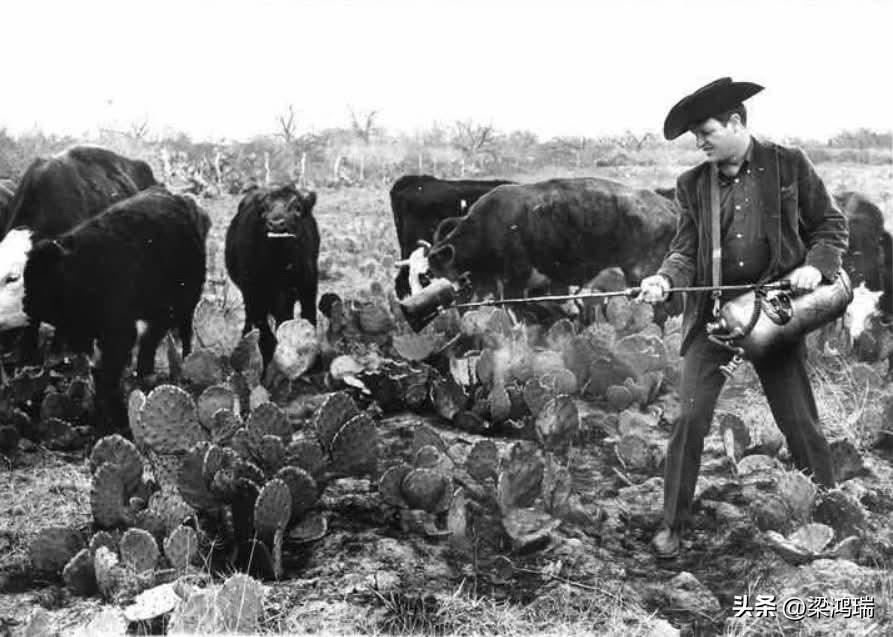 1947年至1956年间,德克萨斯州遭遇了毁灭性的旱灾,牧场主们面临着严峻的困境:如何在水源和食物匮乏的情况下维持牲畜的生存。酷热难耐,降雨稀少,牧场干涸,为牛羊等牲畜提供充足的营养变得异常困难。在如此恶劣的条件下,仙人掌却依然大量生长,这种生命力顽强的植物既能提供水分,又能提供蛋白质。 然而,真正的挑战在于如何让牲畜能够食用仙人掌。仙人掌又长又尖的刺很容易伤到牲畜,导致它们不敢食用。为了解决这个问题,位于德克萨斯州圣安东尼奥的布莱克威尔燃烧器公司设计了一种名为“仙人掌燃烧器”的设备,这是一款简单而有效的装置。该机器利用可控的热量烧掉仙人掌的刺,使仙人掌可以安全食用,同时还能保留其水分和营养价值。 在当地也被形象地称为“刺梨喷灯”(Prickly Pear Burner)的燃烧器的引入在干旱时期彻底改变了牧场主的生存状况,使他们能够度过严酷的夏季,维持牲畜的生存。它成为一种不可或缺的工具,帮助拯救了无数牲畜免于饥饿和脱水,并为德克萨斯州历史上最具挑战性的农业危机之一提供了一个富有创意的解决方案。