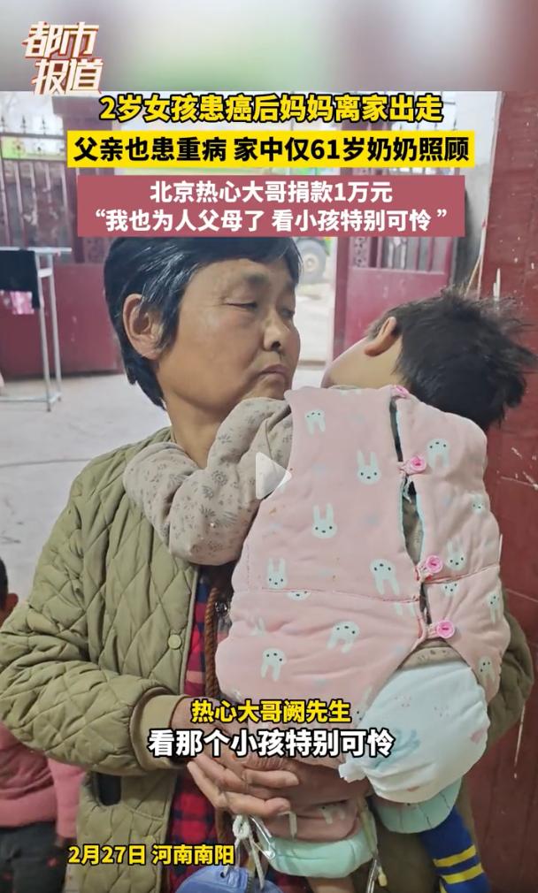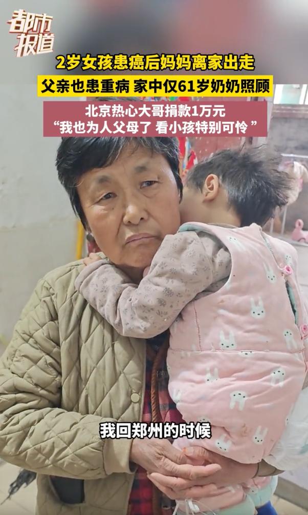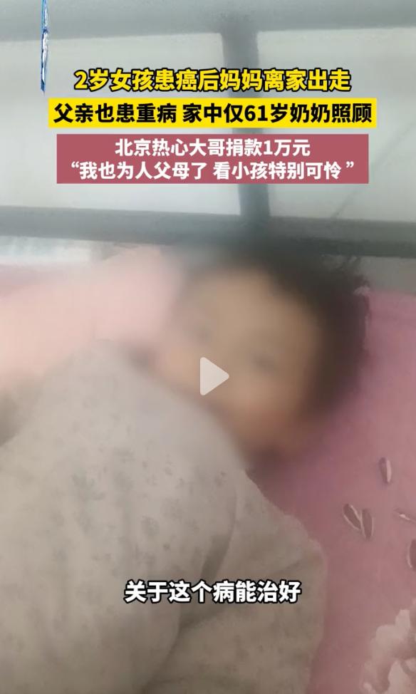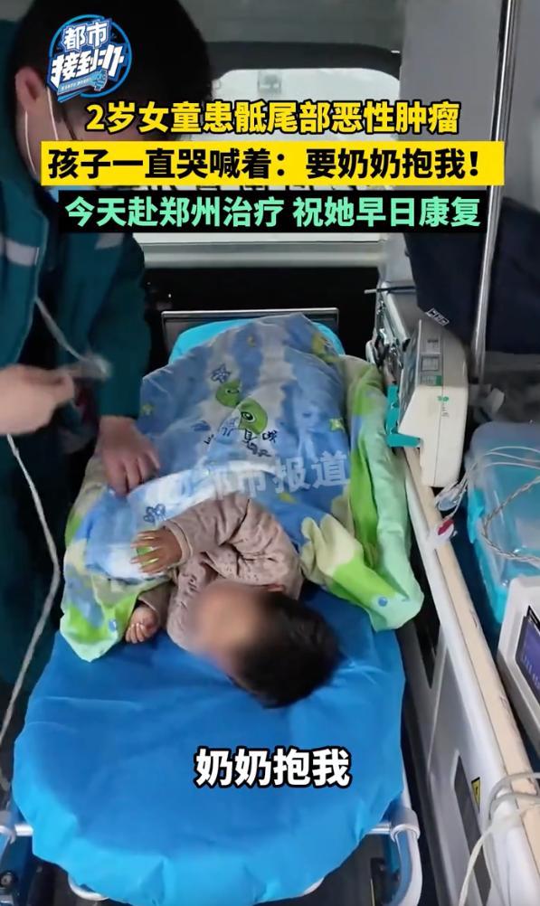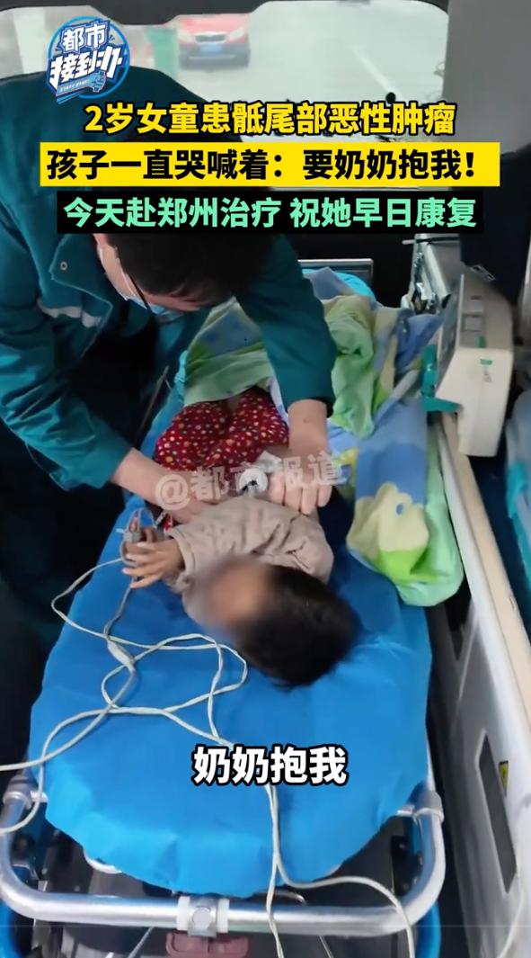 看的心酸!河南一个2岁的小姑娘,9个月大的时候就查出盆腔癌,亲妈狠心走了,亲爹又病了,全靠61岁的奶奶在病床前死守着,这事儿把网友们的心都给看碎了。 视频里,孩子瘦巴巴的,身上穿着件粉色的小马甲,由于疼得厉害,两只小手死死拽着奶奶的衣服,脑袋扎进奶奶怀里,哪怕被病痛折磨得没点精气神,她也只认奶奶。 原来的家也是破破烂烂的,白墙皮都掉了,屋里堆满了药瓶子,最扎眼的就是床头挂着的引流袋,孩子得的是骶尾部恶性肿瘤,肿瘤长得老圆,一碰就疼得大声尖叫。 奶奶今年61岁了,头发全白了,满脸都是皱纹,她穿着旧棉袄,看着孙女疼得嗷嗷叫,她这心里跟刀割一样,直说这病要是能长在她自己身上就好了。 最新消息,孩子被抬上了去郑州的急救车,孩子因为害怕一直哭,嗓子都哑了,不停地喊着要奶奶抱,听得边上的医生护士都跟着抹眼泪。 家里为了治病已经花掉10万多元了,那是全家掏空了家底凑出来的,好在社会上还是好人多,北京一个大哥听说后直接捐了1万元,说自己也是当父母的人,实在看不下去孩子受这份罪。 网友们看了都急坏了,大家都在问有没有捐款的渠道,哪怕一人出点买菜钱,也想把这懂事的孩子给救回来,别让这老的老、小的小就这么干看着着急。 看着孩子哭着喊奶奶的那一幕,我这心里真的特别不是滋味。 2岁的年纪本该在爸妈怀里撒娇,她却要遭这种罪,亲妈在最难的时候走了,谁听了都想骂两句,但冷静下来想想,这其实就是被巨大的经济压力给逼疯了,人性在压力山大的时候确实会想逃避。 说到底,那些在绝境里还咬牙不跑的人才是真英雄,就像这位奶奶,她是拿自己的老骨头在替孩子挡风雨,当然了,我更希望社会保障能再给力点,别让这种走投无路的悲剧再发生了,现在孩子已经去郑州治疗了,希望能出个奇迹,让这小生命能平平安安地回到美好的时光里。