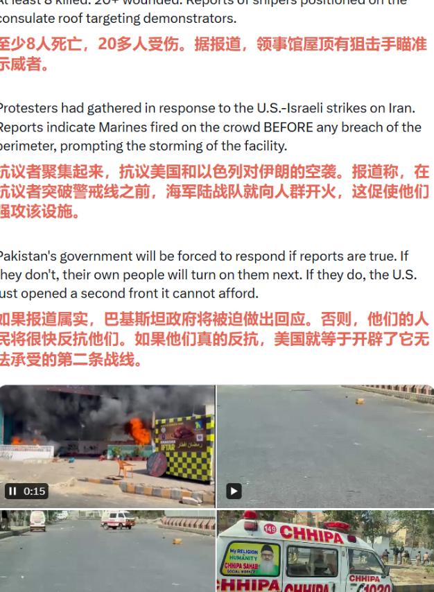 突发新闻!报道称,美国海军陆战队在卡拉奇美国领事馆外向巴基斯坦抗议群众开火。 据多方报道,美国海军陆战队居然在卡拉奇的美国领事馆外面,向聚集的巴基斯坦抗议群众开了火,场面惨烈到让人揪心,目前已经造成至少8人死亡,20多人受伤,每一个数字背后都是一条鲜活的生命,想想都让人头皮发麻。 可能有人还不知道,这次抗议并不是凭空发生的,导火索是此前美国和以色列联合对伊朗发动的空袭,伊朗最高领袖哈梅内伊在此次袭击中不幸身亡,这个消息传到巴基斯坦后,瞬间点燃了当地什叶派民众的怒火,毕竟巴基斯坦有不少民众同情伊朗,认为美以的行为是对伊斯兰世界的冒犯。 当天的卡拉奇,原本平静的街道被愤怒的人群打破,数百名抗议群众聚集在美国领事馆外,举着标语、喊着口号,情绪格外激动,有人试图冲破领事馆的外围防线,还有人砸碎了领事馆的窗户,甚至在附近的警察岗亭放了火,浓烟滚滚,整个现场一度失控。 就在抗议群众的情绪越来越激动的时候,守卫领事馆的美国海军陆战队突然开了火,密集的枪声一下子打破了混乱,现场的抗议群众瞬间慌了神,有的四处奔逃,有的被当场击中倒地,哀嚎声、枪声混在一起,刺耳又揪心。 有现场的目击者说,抬头就能看到领事馆的屋顶上,有狙击手架着枪,枪口一直瞄准着下方的抗议人群,那架势看着就特别吓人,不清楚这些狙击手有没有直接开枪,但光是瞄准的动作,就足够让人胆寒。 据当地救援组织和医院的消息,这次开火造成的伤亡情况十分惨重,至少有8人当场死亡,还有20多人不同程度受伤,其中不少伤者都是 gunshot伤,伤势特别严重,救护车赶到的时候,现场到处都是血迹,医护人员争分夺秒地抢救伤者,把他们紧急送往附近的医院接受治疗,但还有不少人因为伤势过重,没能挺过来。 事件发生后,当地警方和准军事部队很快就赶到了现场,一边发射催泪瓦斯、用警棍驱散聚集的人群,试图控制住局势,一边配合医护人员转运伤者。巴基斯坦信德省的内务部长也紧急下令,要求警方立即汇报事件详情,还强调会对任何破坏法律秩序的行为采取严厉的法律行动,目前当地执法机构已经处于高度戒备状态。 另外,美国驻巴基斯坦的大使馆也发布了相关声明,说正在密切关注领事馆外的示威情况,还提醒在巴基斯坦的美国公民,多关注当地新闻,尽量避开大型人群,做好自身的安全防护。 截至目前,这次事件的具体细节还在进一步调查中,伤亡人数也可能会有更新,后续有新的消息,我们也会第一时间跟大家同步。 本文内容皆为个人看法,如有更好的见解欢迎在评论区留言讨论。