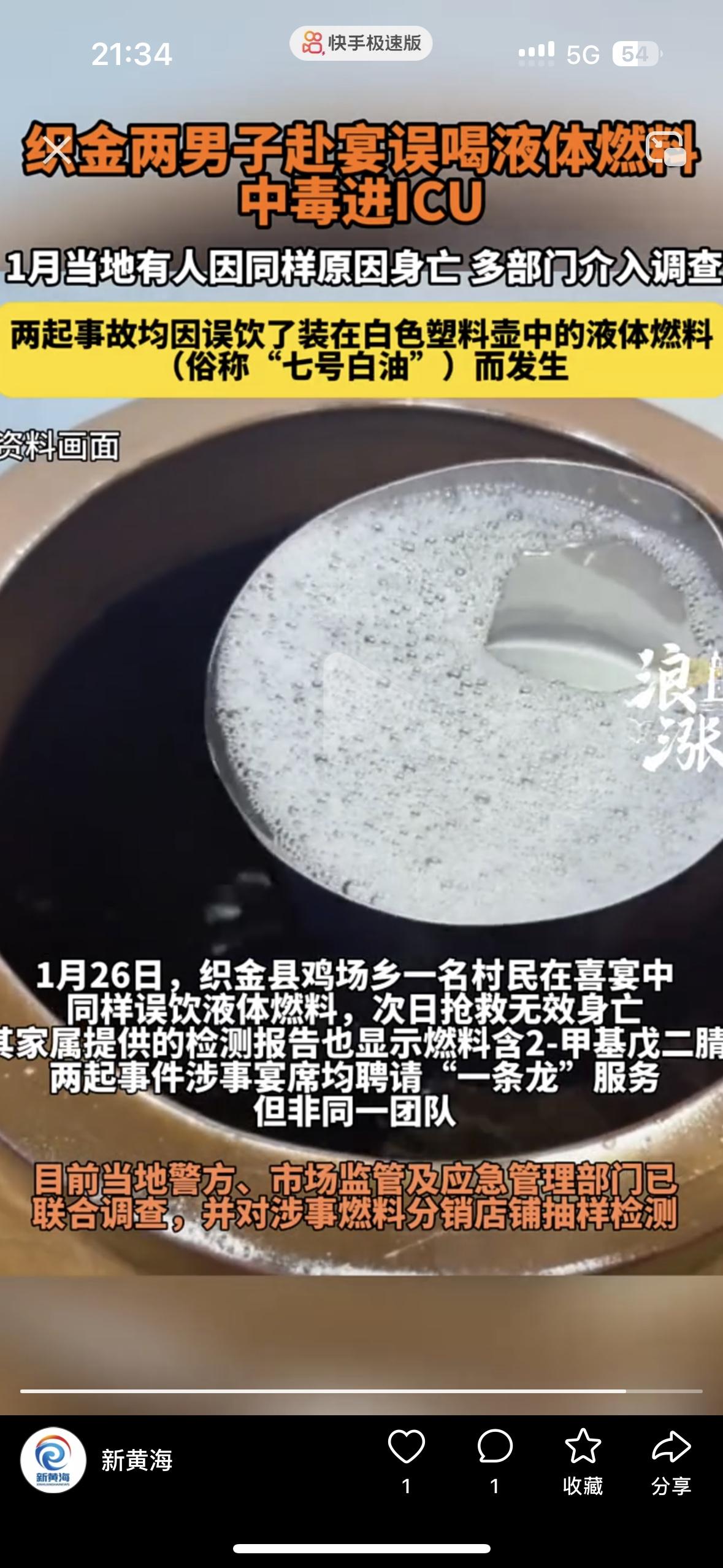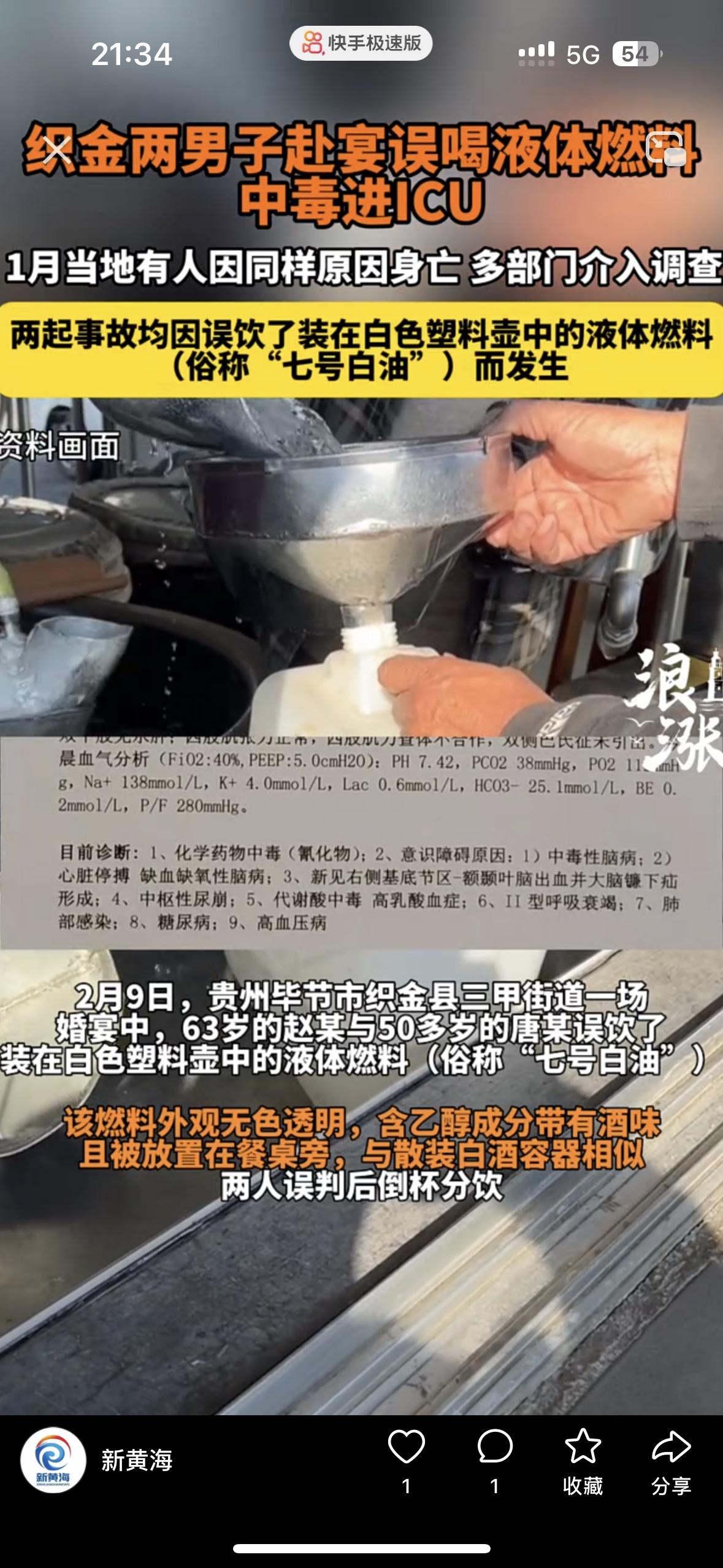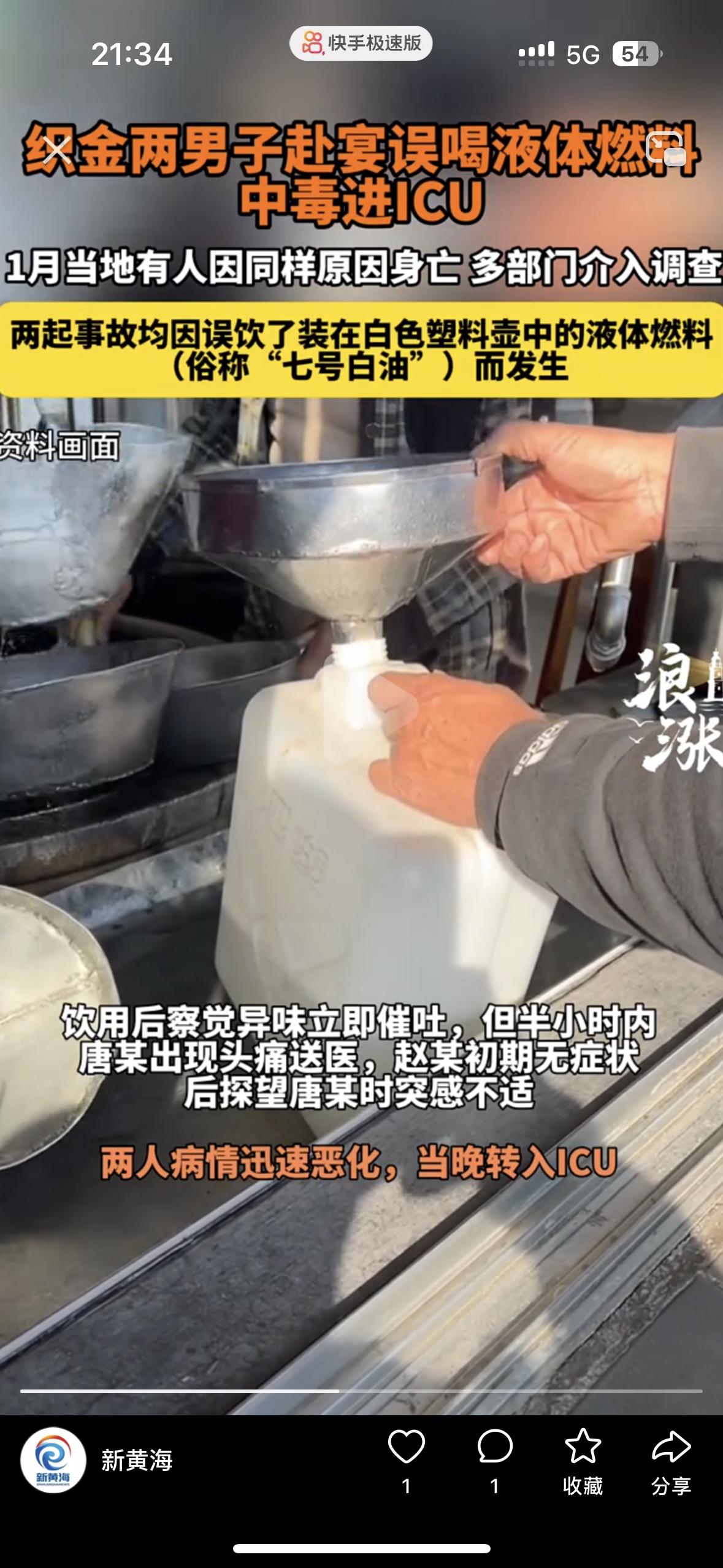 看的头皮发麻,喜宴上喝白酒进了icu,关键是这酒还是夺命的“假酒” 贵州一场婚宴,差点变成了葬礼!63岁的赵某和50多岁的唐某,在酒桌上端起白酒就干杯,谁知道这酒竟然是装在塑料壶里的“七号白油”,也就是一种液体燃料 这玩意还无色无味,带着一股酒味,摆在喜宴桌上,大家都以为是白酒!喝完了察觉不对赶紧催吐,半个小时后唐某就头疼进了医院,赵某一开始没事去医院看望唐某也突然倒下,两个人先后进了ICU,结婚喜宴上的酒按理说都是事先安排好的,能喝到氰化物有些离谱,但还是要多长个心眼,不然怎么死的都不知道!