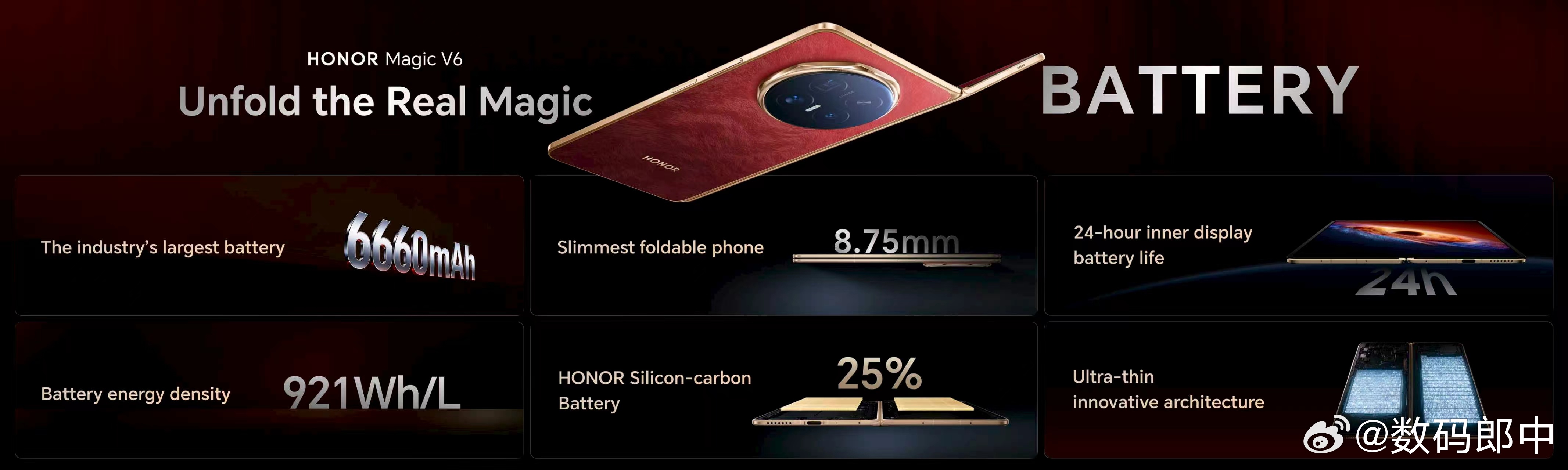 太顶了,Magic V6厚度直接干到8mm级别了8.75这个数应该是折叠屏之最了吧这已经比有的直板旗舰都薄了荣耀MagicV6折叠屏轻薄纪录保持者荣耀Magic V6 不光做薄了,新一代青海湖刀片电池,首次将折叠屏电量提升至7000m+Ah以上,同时以32%最高硅含量、0.15mm最薄叠层厚度、985Wh/L最高能量密度,一举打破四项行业纪录。