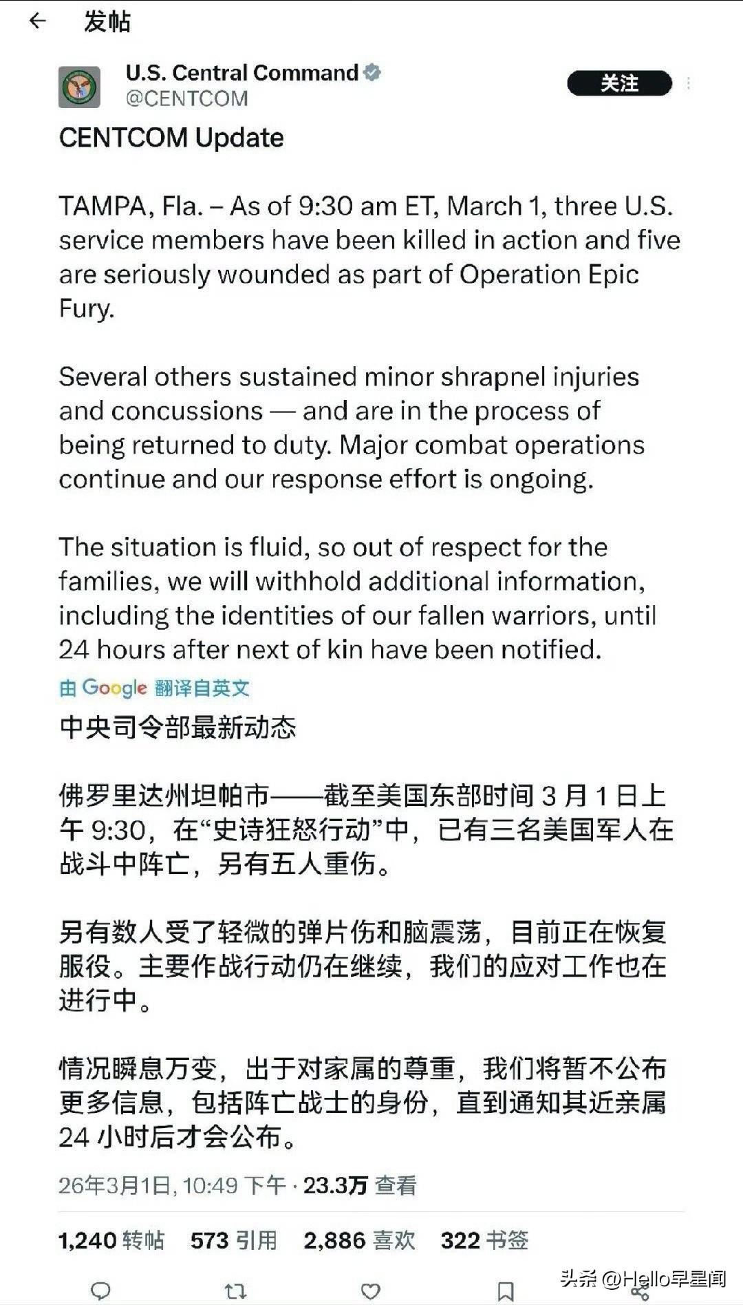 美国林肯号航母应该被击中了! 3月1日下午,美国中央司令部发文: 伊朗攻击已造成美军3死5伤,其他人轻伤或脑震荡。 并表示“情况瞬息万变”,从这句话上可以判断出,伊朗法塔赫已经让林肯号航母上的美军开始惶恐不安了…… ——伊朗今天向阿拉伯海林肯号航母发射了4颗导弹。