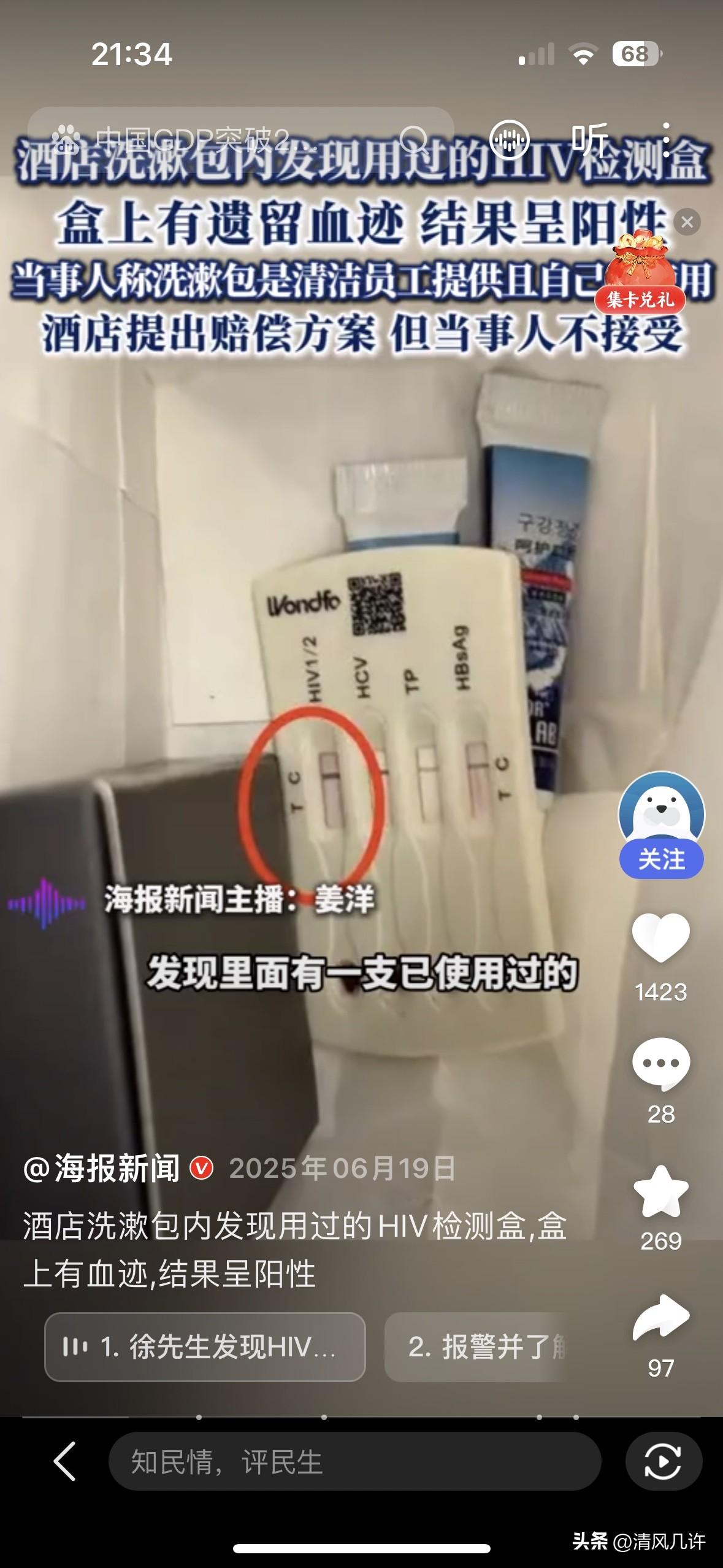 “太吓人了!”北京,男子带着女友住酒店,洗漱完在清洁员给的洗漱包里发现一个小白板,出于好奇拿起来看了看,结果发现上面沾满血,竟然是一个用过的HIV检测盒。 男子徐先生和女友是从山东到北京旅游,入住的是北京崇文门桔子水晶酒店。 事发前一天晚上,他们向清洁员索要了一份洗漱包,当时洗漱包没有密封,他们也没多想,就用了里面的牙膏和牙刷。直到第二天凌晨,徐先生想找棉签的时候,才在洗漱包底部发现了这个带血的检测盒。他用手机查询后确认,这是包含HIV检测的试剂盒,上面的血迹还没完全干涸,而检测区域的“HIV1/2”一项,有一条微弱的显示线,提示结果可能为阳性。 这个发现让他瞬间僵住,他和女友已经直接接触过洗漱包内的物品,未知的感染风险像一块巨石压在两人心头,女友得知后更是控制不住地发抖,原本轻松的旅行计划,瞬间变成了一场挥之不去的噩梦。 徐先生第一时间收好洗漱包和检测盒作为证据,没有和酒店工作人员过多争执,直接拨打了报警电话,同时联系了卫生监管部门。警方和卫健人员赶到后,对现场进行了取证,将检测盒送去专业机构检测。 随后,徐先生和女友连夜前往医院进行检查,当下的HIV抗体检测结果为阴性,但医生明确告知,这个结果只能说明他们此前没有感染,这次是否存在感染风险,需要等待三个月后再次复查,并且为了降低风险,必须连续服用28天的阻断药。服药带来的恶心、乏力等副作用,加上对感染的恐惧,让两人的身心都承受着巨大的压力,原本计划好的景点游览、美食体验,全都被抛到了脑后。 酒店方面的处理方式,更是让徐先生的不满不断升级。事发后,酒店店长先是声称“证据链不完整”,试图推卸责任,随后提出了一个解决方案:垫付3000元医药费、免除当晚2705.28元的房费,再额外赔偿3000元,但要求徐先生签署和解协议,承诺后续不再追究酒店任何责任。 徐先生直接拒绝了这个方案,他清楚地知道,阻断药的费用、后续复查的开支,以及长期的心理焦虑,都不是这几千块钱能覆盖的。他的诉求很明确,酒店必须承担两人后续所有的检查、诊疗和药物费用,公开致歉并全面整改卫生管理体系,而不是用小额补偿来掩盖自身的安全漏洞。 随着事件在网络上发酵,涉事酒店所属的华住集团终于发声,承认清洁员向宾客提供未密封洗漱包的行为,严重违反了酒店客用品安全管理规定,已对涉事员工进行严肃处理。华住方面表示,会承担徐先生和女友后续复查及潜在感染风险的全部责任,但对于检测盒的来源,仍表示警方和卫生部门正在调查中。 东城区卫生健康监督所也介入了调查,重点核查检测盒的来源以及酒店是否存在卫生管理漏洞,按照相关规定,使用过的HIV检测盒属于医疗废物,必须密封封装后交由专业机构处理,绝不能与日常洗漱用品混放,更不能出现在客房内,酒店的行为已经明显违反了相关规范。 这件事也让更多人开始关注酒店卫生安全的问题。不少网友在评论区分享自己的经历,有人遇到过洗漱用品未密封、毛巾有污渍的情况,有人吐槽过酒店清洁流程敷衍了事,而这次带血的HIV检测盒出现在洗漱包里,更是突破了大众对住宿安全的认知底线。 消费者支付费用选择酒店,最核心的需求就是安全与整洁,可部分酒店为了降低成本、简化流程,却放弃了最基本的安全保障义务,将消费者的健康置于风险之中。徐先生的维权,不只是为了自己和女友,更是为了推动整个行业正视卫生管理的漏洞,让更多出行者能住得安心。 在后续的协商中,酒店的态度逐渐软化,最终与徐先生达成了一致,具体的解决方案并未对外透露,但徐先生表示,酒店已经承担了两人的阻断药费用和后续复查的相关开支,也对管理漏洞进行了整改。 可即便如此,两人在三个月窗口期内的担忧,并不会随着协议的签署而消散。每天服用阻断药时的不适,看到相关新闻时的心悸,以及对复查结果的忐忑,都成了这段经历留下的印记。徐先生说,他只希望这件事能给所有酒店敲响警钟,不要让消费者的信任,一次次被不负责任的管理消耗。 住宿安全从来都不是小事,一次管理疏忽,可能给消费者带来长久的健康与心理伤害。 唯有企业严格自律,细化清洁流程,加强员工安全培训,从根源上杜绝此类安全事故;监管部门加大巡查与处罚力度,提高违规成本,倒逼行业规范经营;消费者在入住时留意用品包装完整性,遇到侵害自身权益的情况主动保留证据、合法维权,才能构建起更安全的住宿环境。 各位读者你们怎么看?欢迎在评论区讨论。
