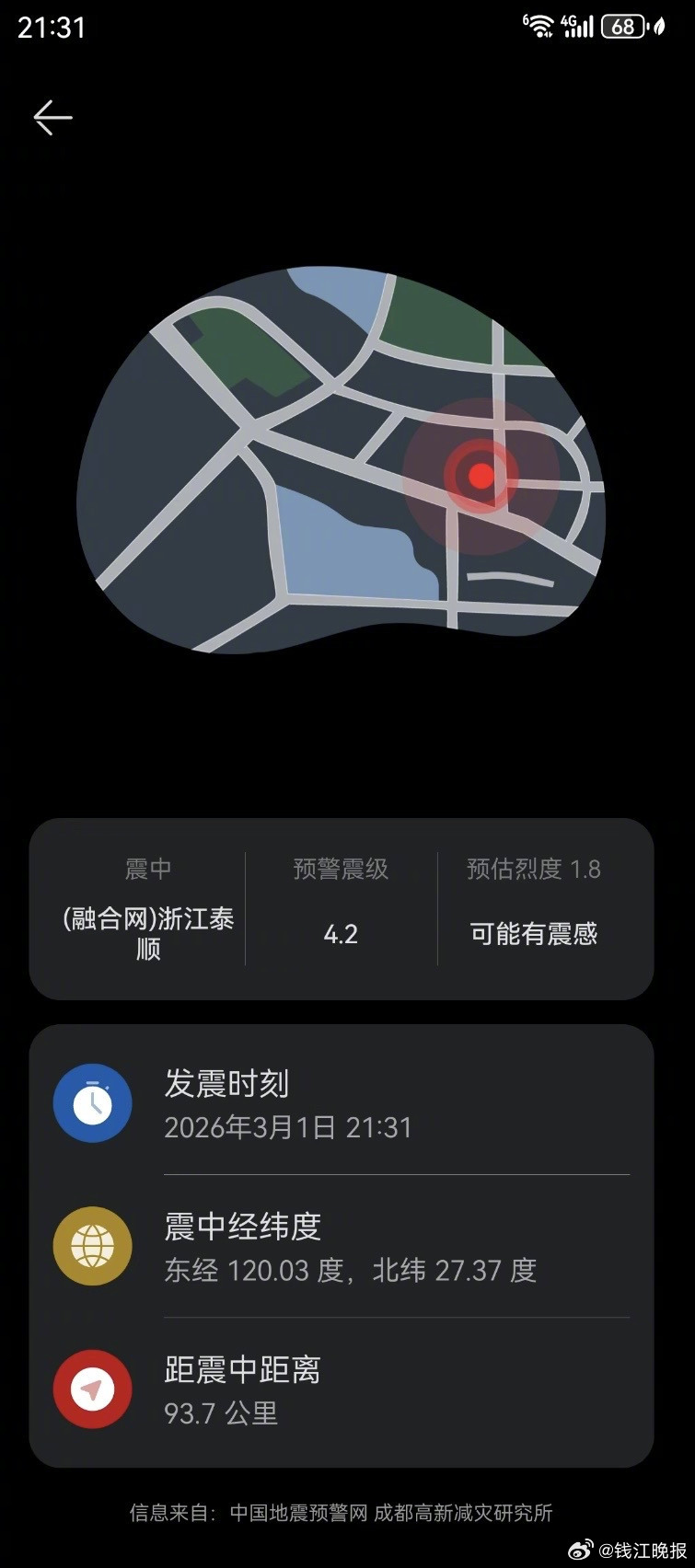 #浙江省地震局辟谣泰顺4.2级地震#【今晚,“浙江地震”冲上热搜,浙江省地震局最新通报来了】#浙江省地震局通报称今晚浙江没地震# “泰顺刚刚发生地震了吗?”3月1日晚,不少浙江网友称,手机上弹出一则地震预警消息:21:31(融合网)浙江泰顺(E120.0,N27.4)附近发生4.2级左右地震。一名温州泰顺的网友说,“正刷着手机,突然弹出地震预警,说是泰顺有地震,地震横波已到达,这还是第一次收到地震预警,着实吓了一跳,但是没感觉到明显震感,问了附近其他朋友,也都说没有感觉。”家住温州鹿城区的李女士告诉潮新闻记者,晚上9点31分,她也在手机上收到了一条地震预警信息,不过没有震感。此外,还有浙江台州、金华等地网友称,也收到了地震预警信息。#浙江地震#一度冲上热搜榜。