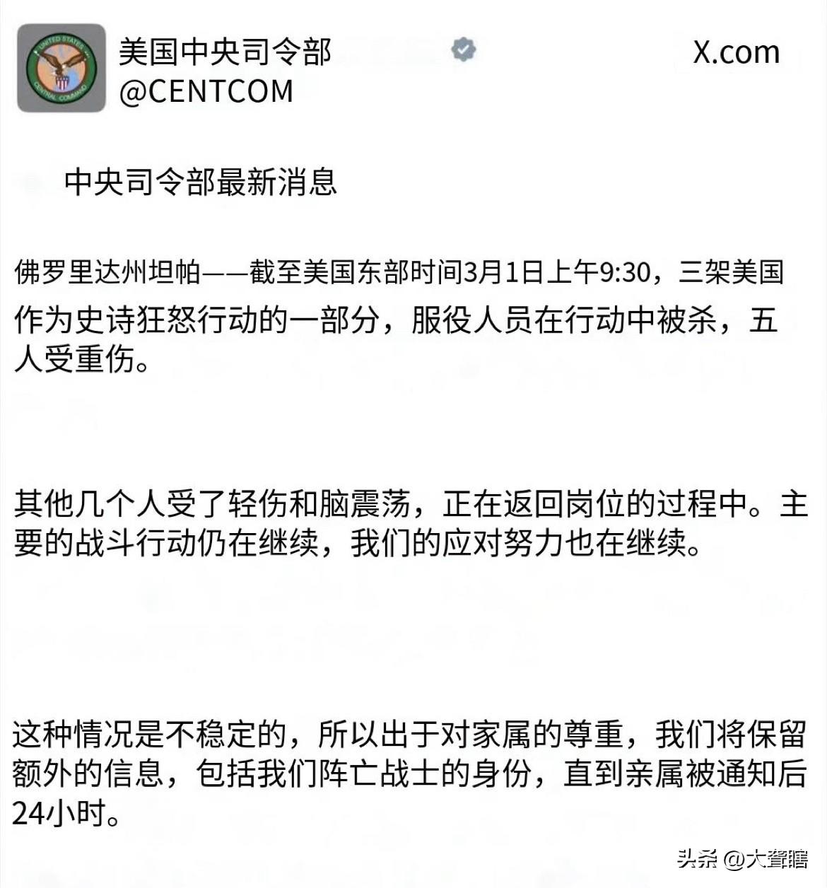 美国承认有3名美军士兵在行动中死亡! 据美国中央司令部消息,有三名美军士兵在针对伊朗的联合军事行动中死亡,另外有5人受重伤,还有一些士兵只是轻微脑震荡,目前正在陆续返回工作岗位。