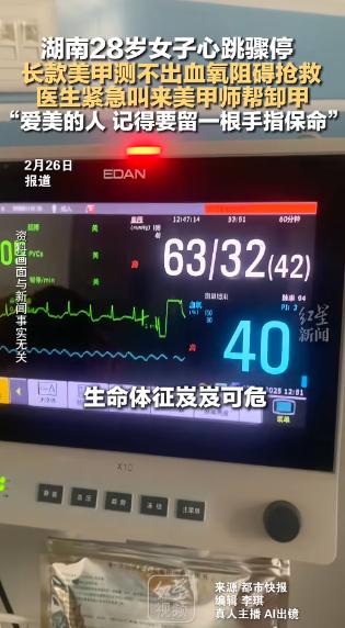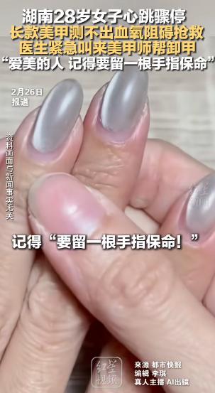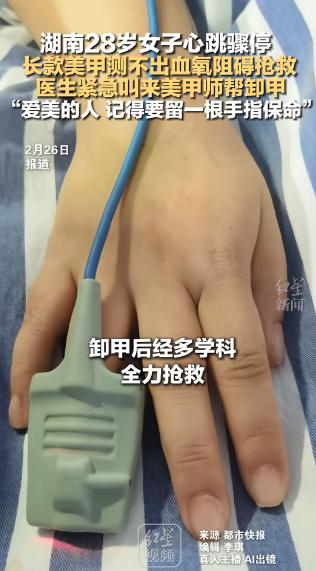 “悲剧还是发生了!”2月5日,湖南,一女子为了好看,便做了长款美甲,没想到突发心肌炎,生命岌岌可危,医生在给她测血氧时,却因为美甲始终测不出,直接耽误救治,最终只能联系美甲师在医院卸甲,才让救治顺利展开!网友:万万想不到! 2026 年 2 月 5 日,湖南省人民医院急诊 ICU 的抢救间里,一场与死神的赛跑因一个意想不到的障碍陷入僵局。 28 岁的丽丽(化名)躺在病床上,深度昏迷,心电监护仪上的波形剧烈震荡,频繁室颤的警报声刺破空气。 此时,医护人员最急需的血氧饱和度数据,却始终显示为 “0”—— 这个关键指标的缺失,让所有抢救措施失去了精准调整的依据。 这场危机的始作俑者,是丽丽十指上那副她佩戴了三年的长款延长甲。 指甲上覆盖着较厚的甲片,叠加多层甲油胶并经过封层处理,坚硬且不透光。 正是这层看似精致的 “铠甲”,彻底阻断了指脉氧仪的红光与红外光穿透,让仪器彻底失灵。 湖南省人民医院急诊一部副主任李想医生事后解释,美甲对监测的干扰主要来自三方面:物理厚度阻挡光线、深色涂层吸收信号、装饰材质引发折射紊乱,而丽丽的美甲恰好集齐了所有风险点。 丽丽被转诊至该院时,生命体征已濒临崩溃。 她的收缩压仅 50mmHg,远低于 90-140mmHg 的正常范围,心率飙升至 130 次 / 分钟,确诊为暴发性心肌炎引发的心源性休克与心跳骤停。 抢救团队第一时间启动最高级别响应:气管插管接呼吸机,将氧浓度调至 80%;建立双静脉通路,同步输注升压药与抗心律失常药;ECMO 人工心肺系统迅速运转,替代其失效的心肺功能。 一切本应按流程推进,直到护士尝试夹上指脉氧仪。 这台仪器是急危重症抢救的 “眼睛”,能实时捕捉血氧变化,其无创监测的特性比抽血化验更适合分秒必争的现场。医护人员先后尝试了她的双手十指,甚至双脚,结果均为无效。 用剪刀、止血钳手动卸甲的尝试也宣告失败,封层后的甲油胶韧性极强,稍一用力就可能划伤患者手指,引发二次伤害。 危急时刻,ICU 主任当机立断,拨通了附近美甲店的电话。 很快,一位美甲师携带电动打磨机、卸甲水等全套工具赶到。 在严格的无菌防护下,她在抢救间隙展开操作:先以打磨机磨穿封层,再用卸甲棉软化甲油胶,最后快速剪除甲片并打磨平整。 整个过程精准而克制,全程未干扰医护人员的操作。 最后一片甲片被移除,指脉氧仪重新夹上的瞬间,屏幕上跳出的数字让所有人心头一紧 ——72%,远低于 95%-100% 的正常标准。 正是这个迟到的数据,让医护人员立刻调整了呼吸机参数与 ECMO 运转速率,优化了用药剂量。 多学科团队的协同作战终于发挥作用,丽丽的室颤逐渐平息,血压开始回升,血氧饱和度稳步恢复至正常范围。 这场抢救的波折,并非孤例。 该院急诊科表示,近期已接诊多例因美甲影响诊疗的患者:有的因深色美甲遮挡甲床青紫,延误了缺氧判断;有的因钻饰美甲导致监测失灵,耽误了急救时机。 更值得警惕的是,长期佩戴厚重美甲本身就存在健康风险,可能破坏指甲保护层,引发甲沟炎或真菌感染。 丽丽的经历,为所有爱美人士敲响了警钟。 她曾因贪恋美观,无视家人提醒,即便日常拧瓶盖需借助工具、做家务频繁勾拽衣物,也不愿更换短款美甲。 如今,这场生死考验让她彻底改变了想法。 康复后的丽丽坦言,她再也不会为了精致忽视安全。 而医生给出的建议更具实操性:优先选择短款、轻薄的美甲款式;就医前主动卸除厚重装饰;最关键的是,可刻意保留一根手指不做美甲,作为紧急情况下的监测备用选择。 抢救室里的紧急时刻,看似短暂,却浓缩了现代精致生活与生命安全的深刻博弈。 美甲本身无罪,但当它在生死关头成为阻碍救援的 “隐形杀手” 时,我们不得不重新审视:所有的美,都应建立在对生命的敬畏之上。 如果各位看官老爷们已经选择阅读了此文,麻烦您点一下关注,既方便您进行讨论和分享,又能带来不一样的参与感,感谢各位看官老爷们的支持!