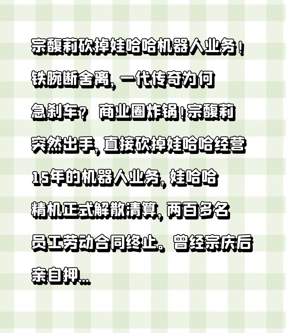 宗馥莉砍掉娃哈哈机器人业务!铁腕断舍离,一代传奇为何急刹车? 商业圈炸锅!宗馥莉突然出手,直接砍掉娃哈哈经营15年的机器人业务,娃哈哈精机正式解散清算,两百多名员工劳动合同终止。曾经宗庆后亲自押注的明星赛道,如今被女儿亲手按下停止键,这背后到底藏着怎样的商业棋局? 很多人不解,娃哈哈机器人业务可是宗庆后的心血。2011年布局,拿下国家863项目、工信部重大专项,研发串联、并联机器人,用于生产线装箱码垛,一度要做成高端装备产业。宗庆后曾放话,不仅自己用,还要对外输出,打造第二增长曲线。 可现实很骨感。投入十几亿,折腾十几年,机器人业务始终叫好不叫座,盈利遥遥无期,反而持续烧钱,拖慢主业脚步。一边是农夫山泉、元气森林穷追猛打,饮料市场内卷到极致;一边是跨界业务分散资金、人力,娃哈哈逐渐陷入增长困境。 宗馥莉接班后,彻底推翻父亲“大而全”的多元化路线,掀起“减法革命”。从注销2亿注册资本的电商公司,到关停芯片、健康管理等8家边缘企业,再到这次砍掉机器人业务,每一步都干净利落。她的逻辑很简单:放弃非核心,死磕饮料主业,把钱和精力用在刀刃上。 有人说她不念旧、否定父辈成果;也有人赞她清醒果断,长痛不如短痛。其实这不是背叛,而是传承。宗庆后时代靠多元化铺规模,现在消费环境变了,大企业最该做的是聚焦、做精、做强。砍掉不赚钱的副业,把资源投到新品研发、渠道升级、品牌年轻化上,才是活下去、活得好的关键。 这场改革也给所有企业敲响警钟:风口再热,不适合自己就是陷阱;规模再大,没有盈利都是虚胖。做企业不怕犯错,就怕不敢断舍离。宗馥莉用行动证明,二代接班不是守业,而是破局,该砍就砍、该停就停,才能让老牌企业轻装上阵。 从宗庆后的大胆跨界,到宗馥莉的聚焦深耕,娃哈哈的转型,正是中国传统企业升级的缩影。真正的企业家精神,不是永不放弃,而是懂得适时放手。