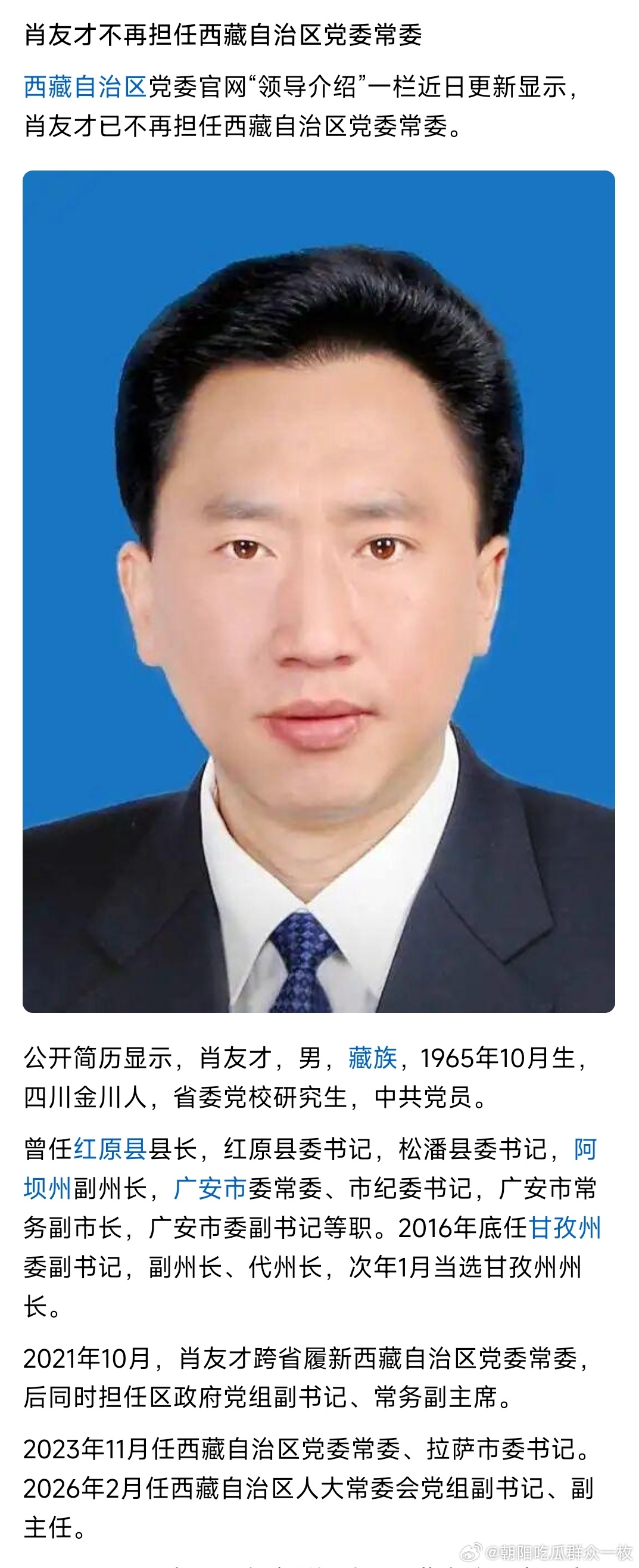 肖友才不再担任西藏自治区党委常委,此前已任西藏自治区人大常委会党组副书记、副主任。