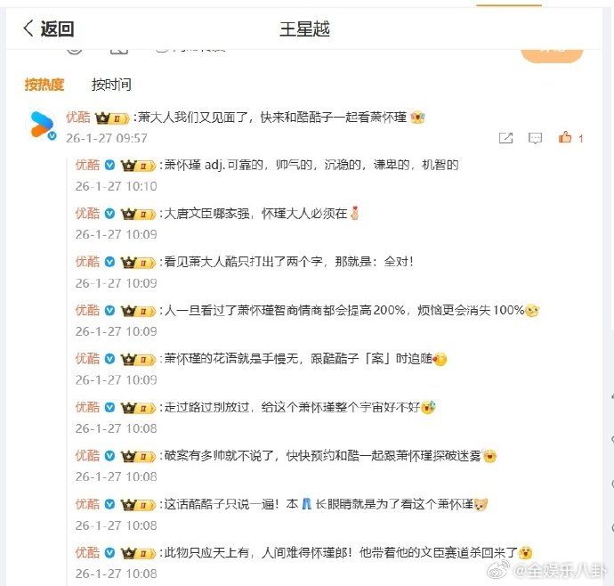 优酷把王星越宠上天优酷这波操作真的很圈路人好感,对艺人用心,宣传到位,粉丝看得开心,剧也能被更多人看到。王星越粉在优酷吃得太好了周五晚高疯