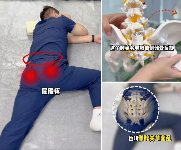 “跨栏式”睡姿,通常是把上方的膝盖搭下来,前胸压向床的一侧,同时一侧手臂往往被压在身下。这一睡姿会导致单侧髂骨后旋,时间长了,容易出现后腰两侧“腰窝”疼,也叫骶髂关节紊乱,表现为腰痛、屁股痛、下肢串麻酸胀等不适。