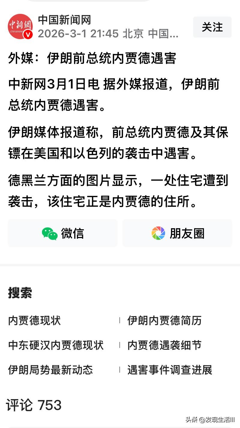 刚确认了哈梅内伊的死亡信息,又传出内贾德遇害身亡的消息,感到很是震惊,接连两位反美斗士被定点清除,只有一种可能:清除反对派,为亲美派上台扫清障碍,从对伊朗打击的战果来看,美以的战略目的看来是实现了,扶持一个亲美派,轻松实现美国对伊朗的控制,完成对霍尔木兹海峡的绝对封锁。 这条全球石油供应的命脉,承担着全球约三分之一海运石油贸易的运输重任。届时,美国无需发动战争,只需通过军事演习或制造摩擦,就能轻易扰动全球能源市场,将油价推高至新兴经济体难以承受的水平,从而精准打击其经济命脉。这种能源武器化,将成为悬在中俄头顶的达摩克利斯之剑。