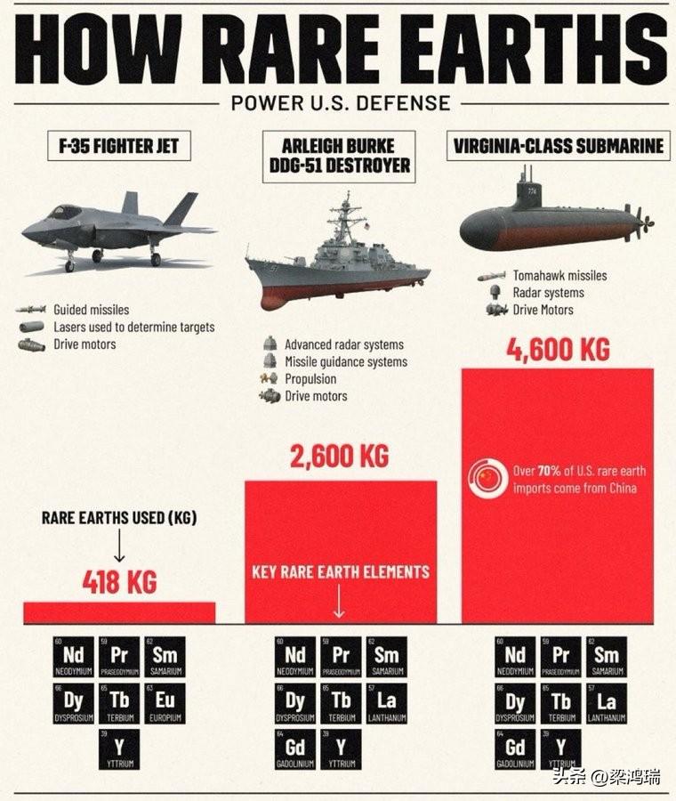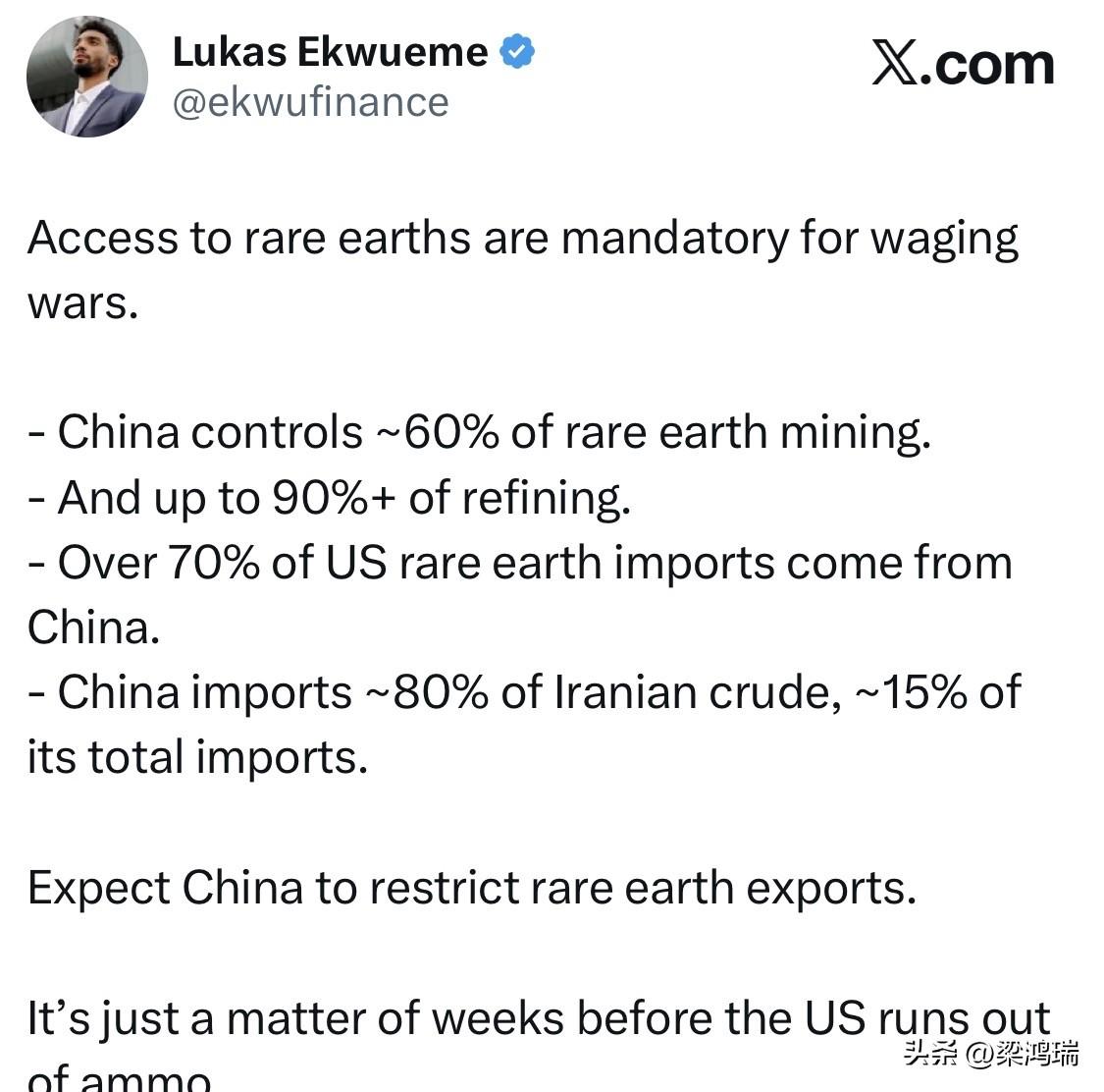 获取稀土资源是发动战争的必要条件。 中国控制着全球约60%的稀土开采。 - 以及高达 90 %+的精炼。 - 美国稀土进口的70%以上来自中国。 - 中国进口伊朗原油约80%,约占其进口总量的15%。 预计中国将限制稀土出口。 美国弹药耗尽只是时间问题。 这份信息图表展示了稀土元素(Rare Earth Elements, REEs)在美国国防工业中的关键作用,重点列出了三类主要军事平台的稀土消耗量及其具体用途。 稀土元素因其独特的磁性、耐热性和电导性,成为现代武器系统中不可或缺的“维生素”。图中展示的三个平台消耗量如下: F-35 战斗机: 每架约消耗 418 公斤 稀土。 用途: 导弹制导、目标定位激光器、雷达系统、隐身涂层以及控制舵面的电动机。 阿利·伯克级驱逐舰 (DDG-51): 每艘约消耗 2,600 公斤 稀土。 用途: 先进雷达系统、导弹制导系统、推进系统和驱动电机。 弗吉尼亚级核潜艇: 每艘约消耗 4,600 公斤 稀土。 用途: 战斧巡航导弹、声呐与雷达系统、推进电动机及辐射屏蔽。 关键稀土元素及其角色 图中提到的主要元素包括: 钕 (Nd) 与 镨 (Pr): 用于制造高性能永久磁铁,支持飞行控制、推进和隐身功能。 钐 (Sm): 钐钴磁铁具有极佳的耐高温性,广泛用于导弹和电子战系统。 铽 (Tb) 与 镝 (Dy): 提高磁铁在极端战斗环境下的热稳定性和耐用性。 钇 (Y): 关键于雷达频率调节、吸波隐身材料以及喷气引擎的耐热陶瓷。 信息图特别指出,美国 超过 70% 的稀土进口来自中国。
