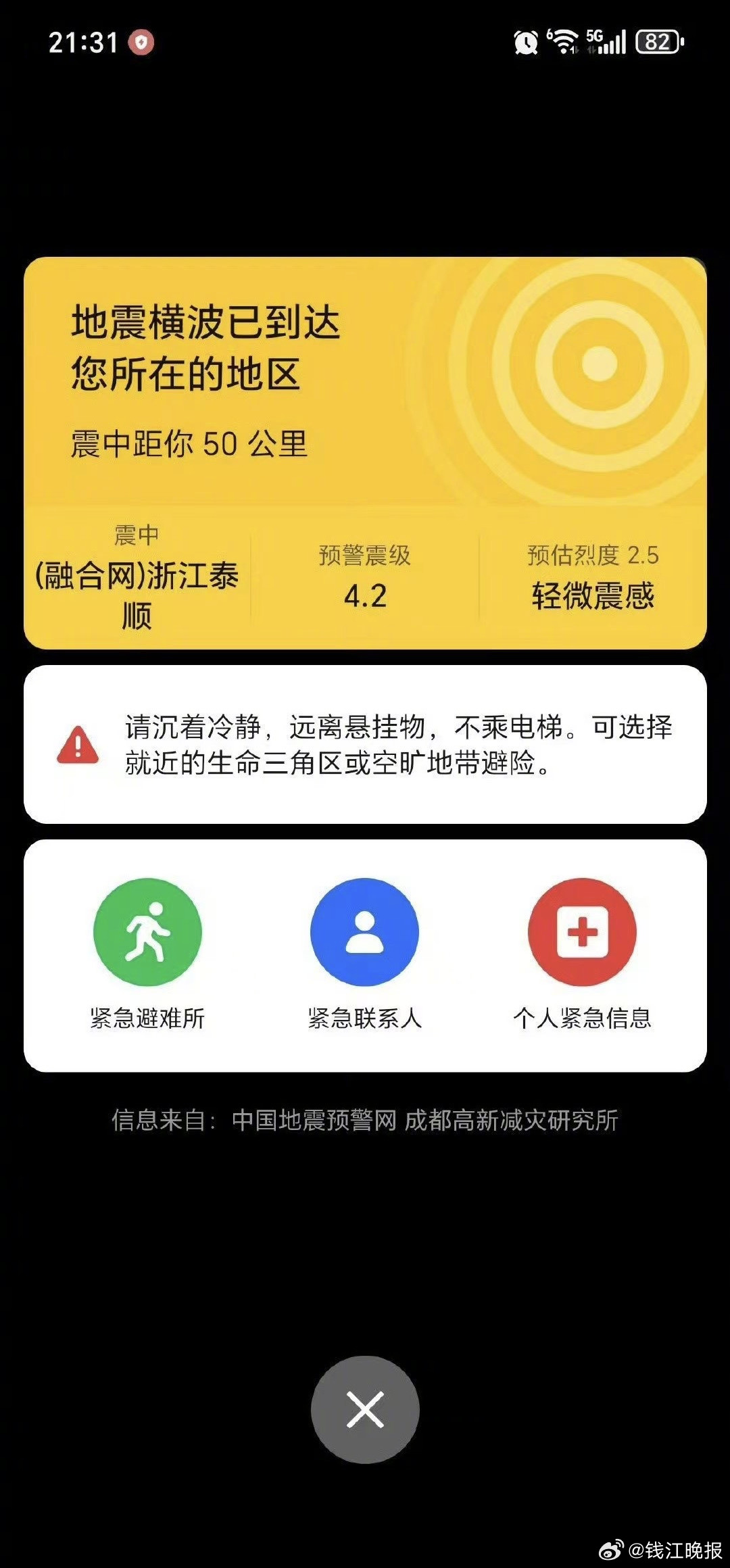 #浙江省地震局通报称今晚浙江没地震#【#浙江地震#冲上热搜,浙江省地震局通报来了】#浙江省地震局辟谣泰顺4.2级地震# 3月1日晚,不少浙江网友称,手机上弹出一则地震预警消息:21:31(融合网)浙江泰顺(E120.0,N27.4)附近发生4.2级左右地震。22:59,发布通报——据福建地震台网正式测定:03月01日21时31分,在福建宁德市柘荣县(北纬27.20度,东经119.88度)发生2.1级地震,震源深度6千米。震中距温州市约118千米,丽水市约139千米,金华市约211千米,衢州市约217千米,杭州市约343千米。成都高新减灾研究所未经授权同意,非法发布预警信息,称浙江泰顺发生4.2级地震,引起社会广泛关注。该时间段我省域内无地震事件发生,请社会各界关注我局官方发布渠道,不必恐慌。(潮新闻 记者 金檬)