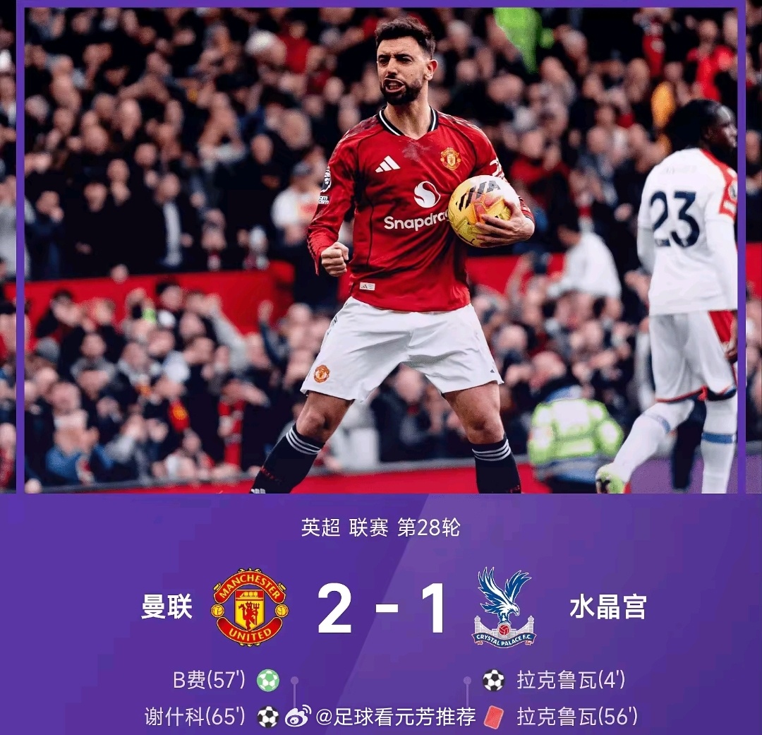 B费全场最佳。曼联2比1水晶宫
