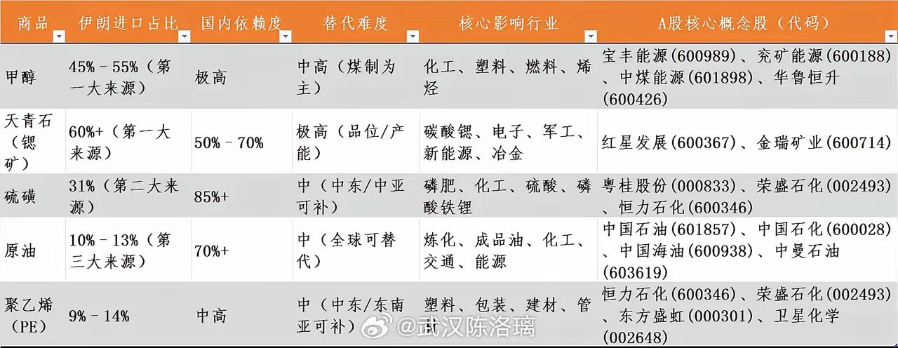 明天开盘怎么办?综合伊朗被打局势,豆包给我的建议,感觉挺有道理,明天搞三成仓进一些煤化工、锶矿。具体说明:伊朗是中国原油、甲醇、天青石、硫磺、聚乙烯等关键原料的重要甚至第一大来源,地缘波动易引发价格与供应风险。1、甲醇:伊朗是中国第一大进口来源,煤制甲醇是国内主要替代路线,宝丰能源为国内最大产能主体。2、天青石:伊朗占进口60%+,国内品位低、产能有限,替代难度最高,价格弹性最大。3、硫磺:伊朗占进口31%,国内主要靠硫铁矿与炼化副产,春耕刚需下价格易涨。4、原油:占进口10%–13%,全球供应多元,影响主要在油价与运输通道(霍尔木兹)。5、聚乙烯:伊朗占进口9%–14%,国内大炼化产能充足,替代相对容易。