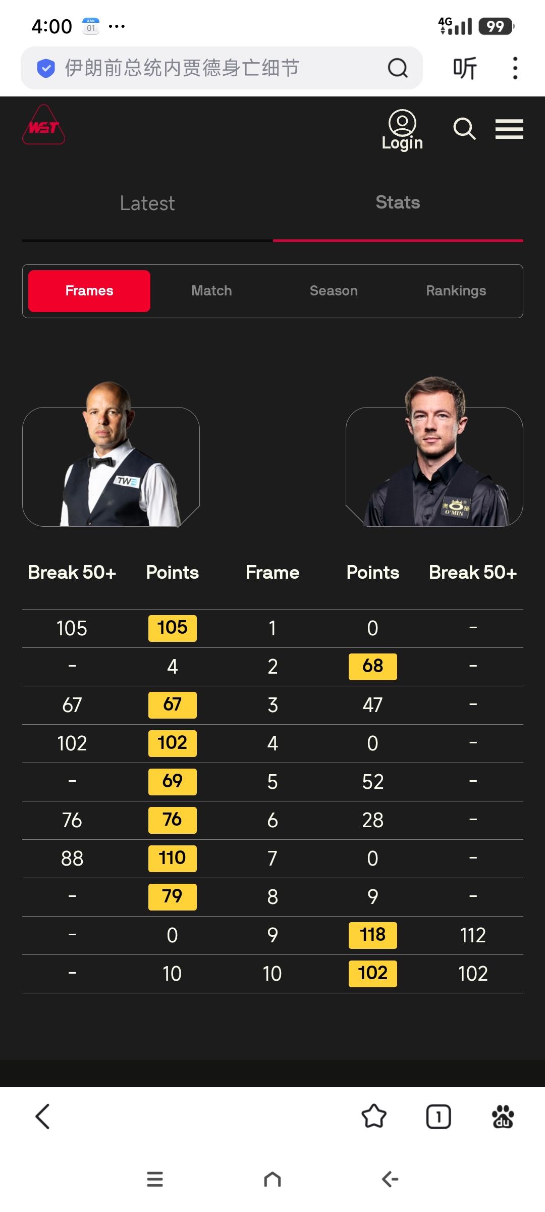巴里·霍金斯 7-3 杰克·利索夫斯基 3月1日21点,斯诺克威尔士公开赛决赛开杆,17局9胜赛制,巴里·霍金斯对阵杰克·利索夫斯基。 第一阶段共打八局,巴里·霍金斯打出两杆破百三杆50+,7-1领先杰克·利索夫斯基。 3月2日凌晨3点,第二阶段比赛开始,杰克·利索夫斯基开始爆发,连打两杆破百,比分3-7落后巴里·霍金斯。